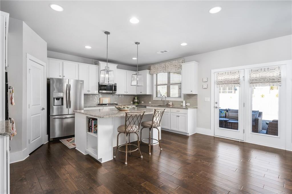- KitchenBreakfast Bar, Breakfast Room, Cabinets White, Kitchen Island, Pantry Walk-In, Stone Counters, View to Family Room