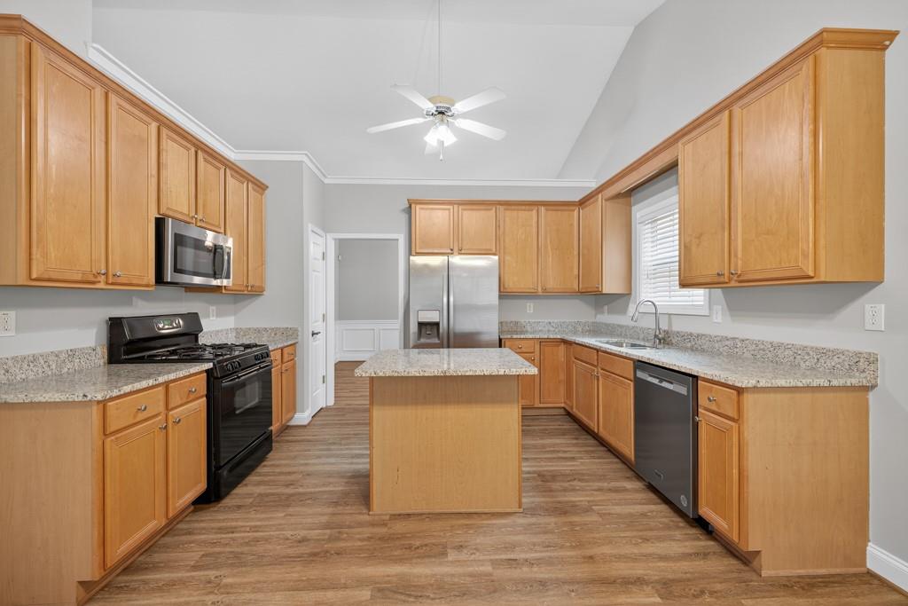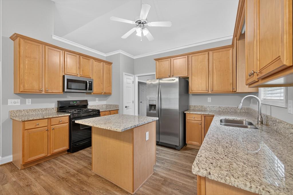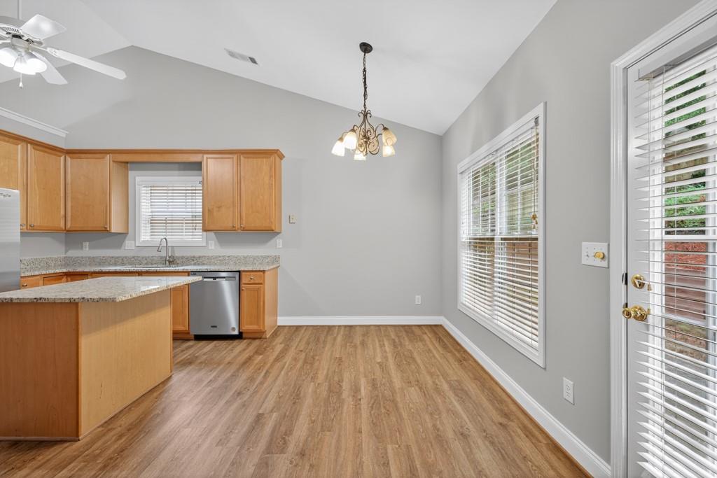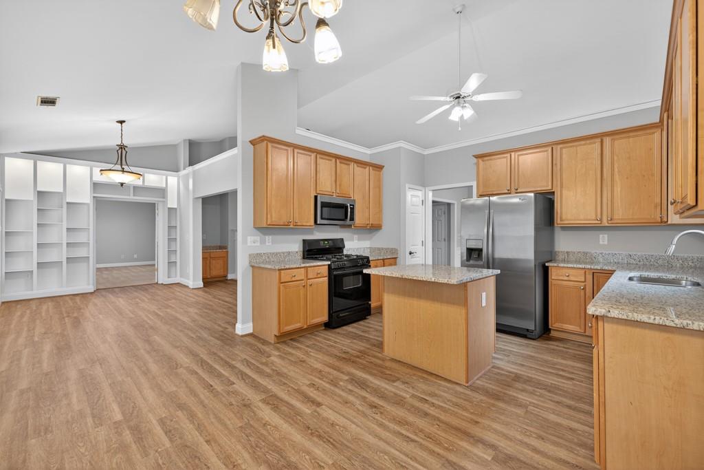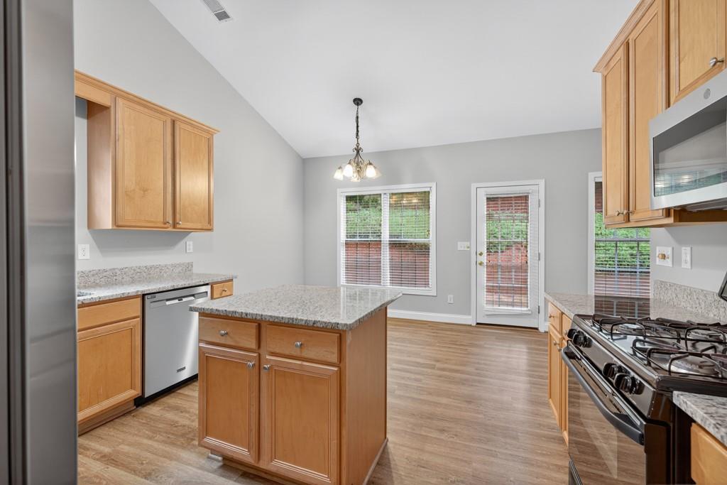 - KitchenCabinets Stain, Eat-in Kitchen, Kitchen Island, Pantry, Stone Counters, View to Family Room