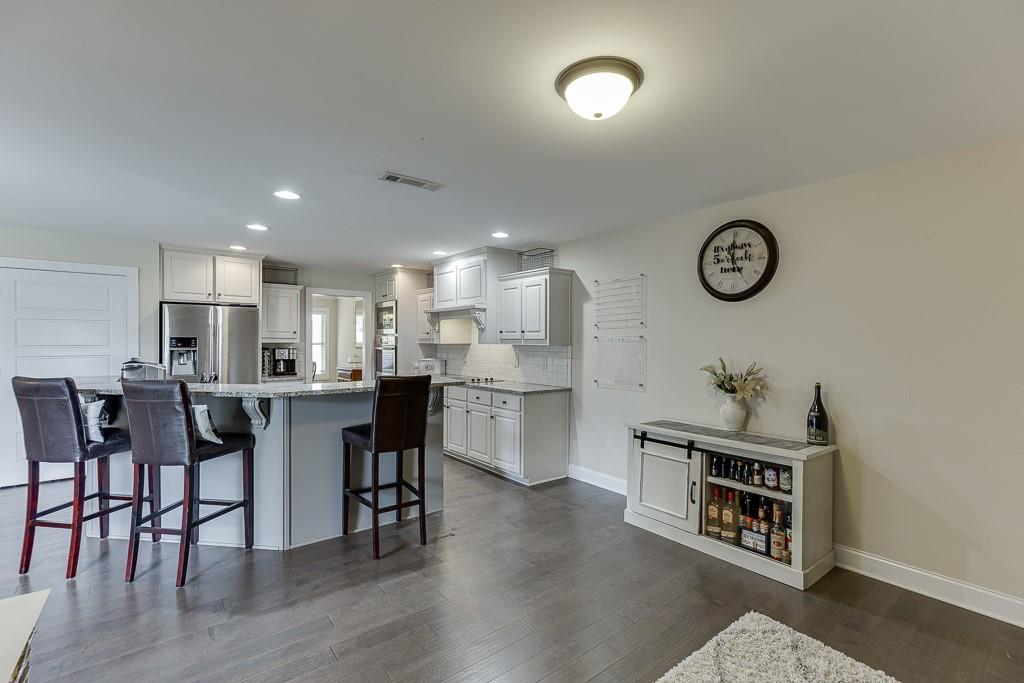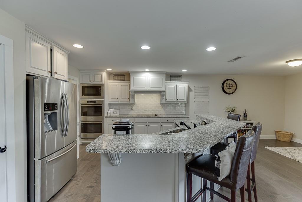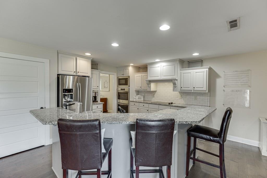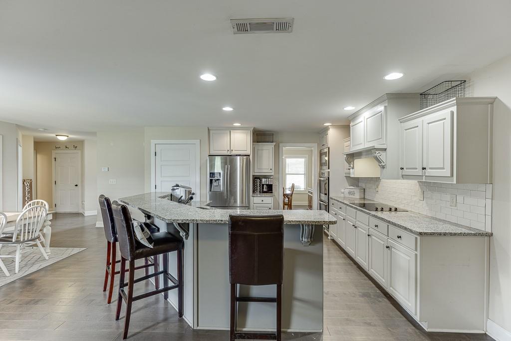 - KitchenBreakfast Bar, Breakfast Room, Cabinets White, Eat-in Kitchen, Kitchen Island, Pantry, Stone Counters, View to Family Room