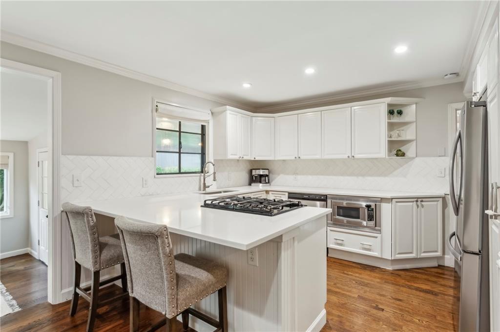 - KitchenBreakfast Bar, Cabinets White, Eat-in Kitchen, Solid Surface Counters