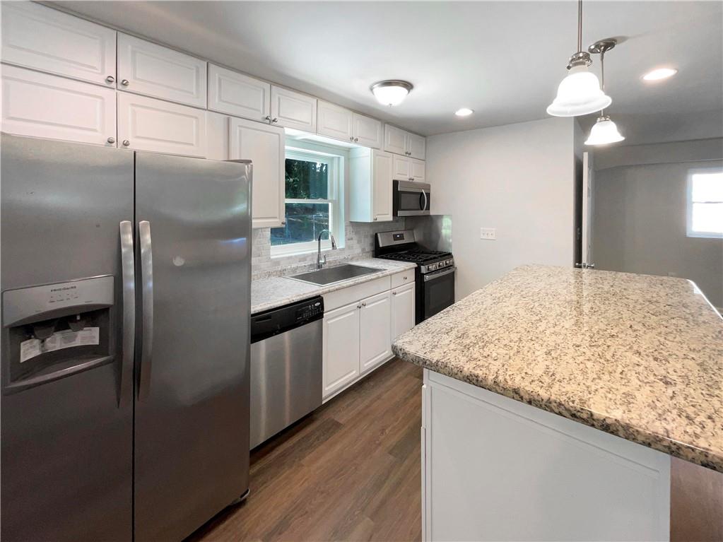 - KitchenCabinets White, Eat-in Kitchen, Kitchen Island, Pantry Walk-In, Stone Counters, View to Family Room