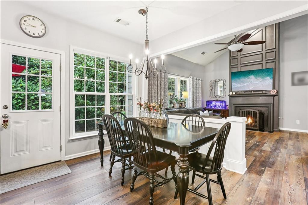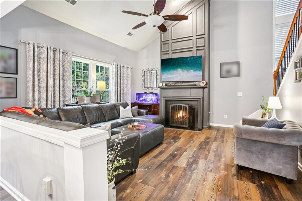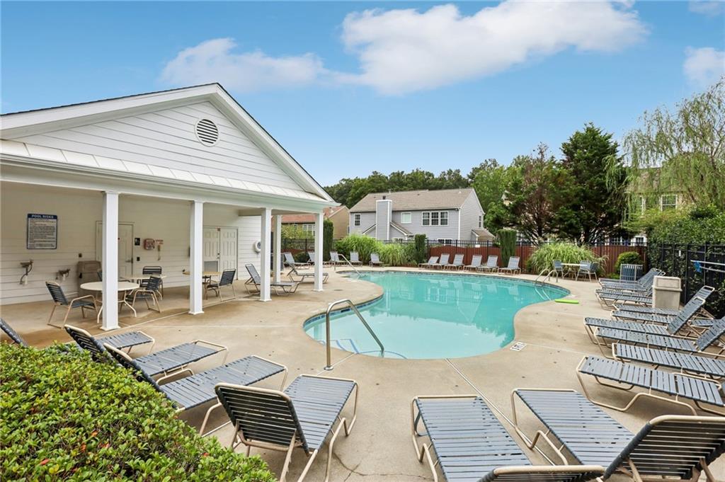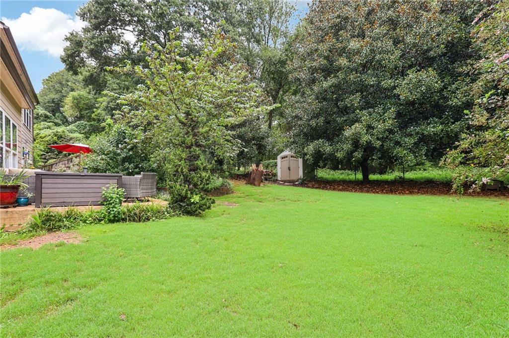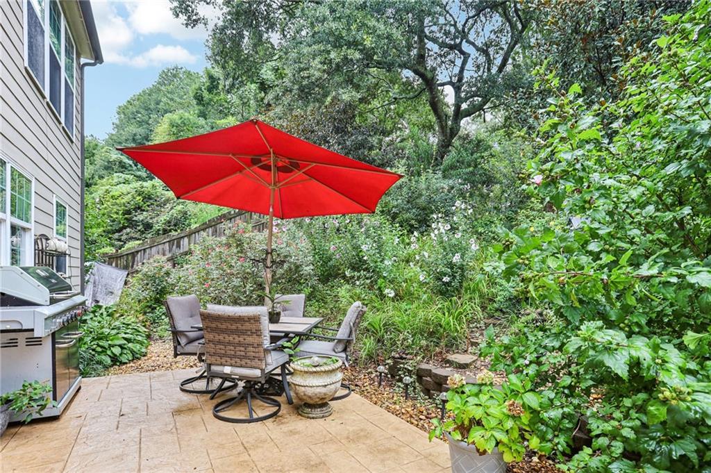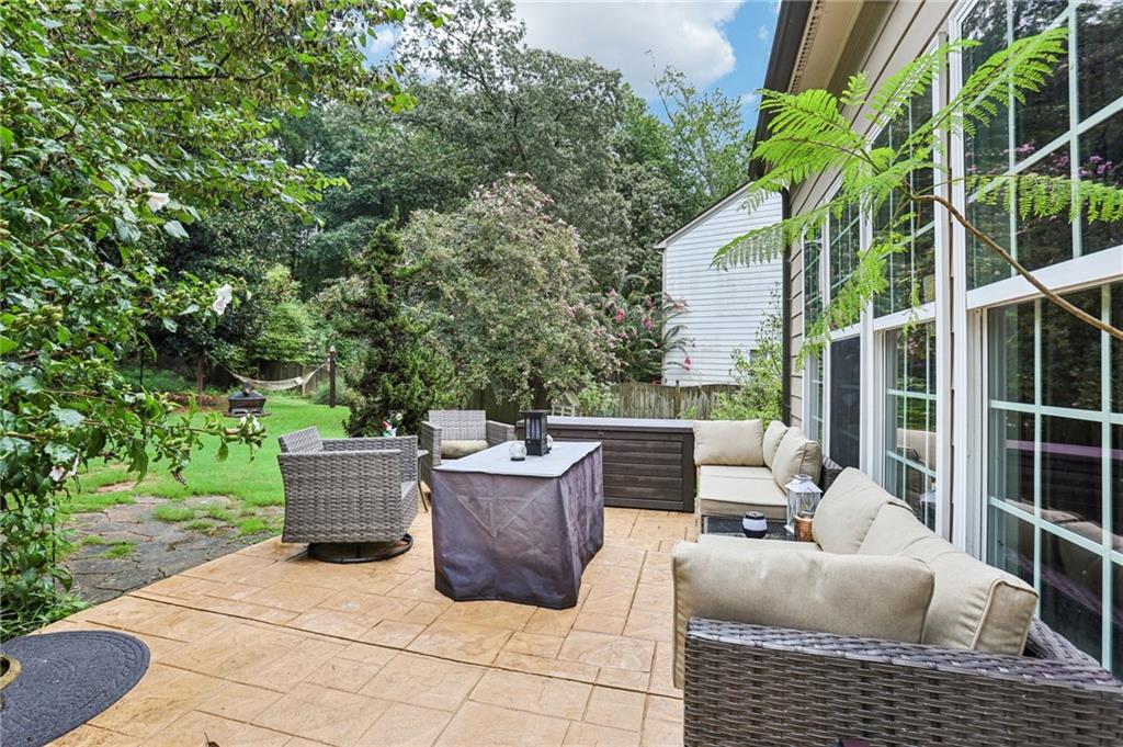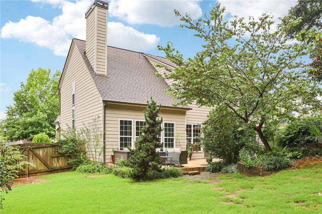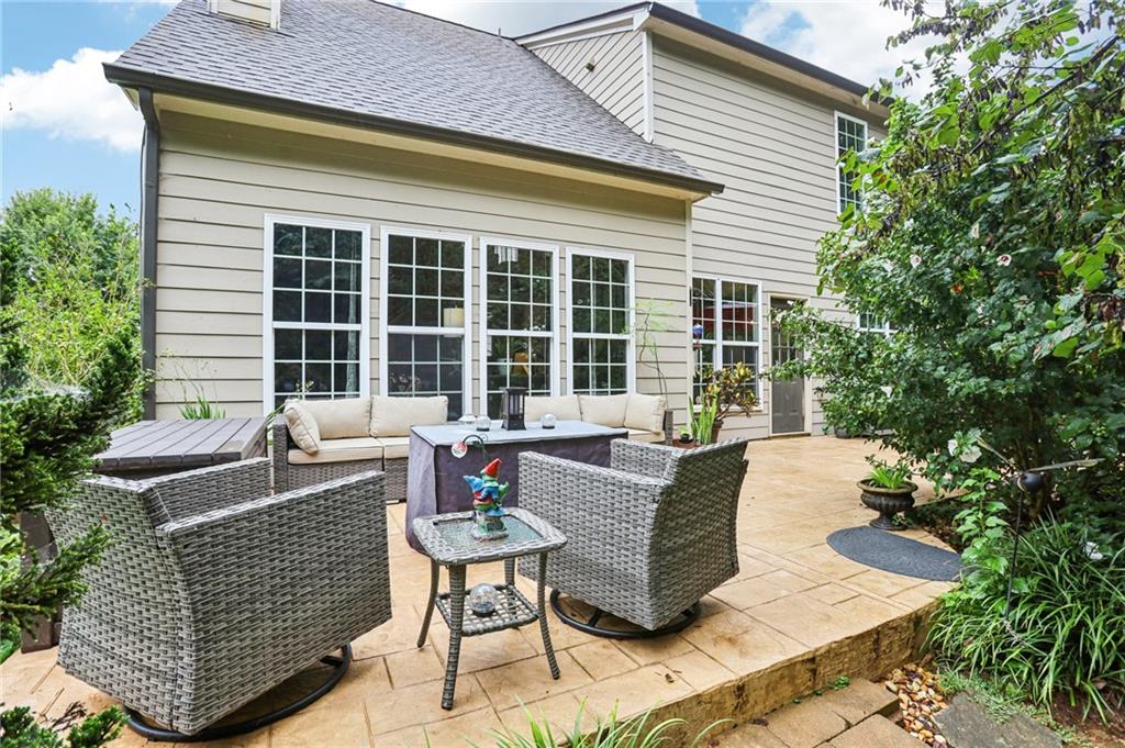 This awesome home in the South Forsyth district has SO many things to love: Popular open floor plan, lots of great upgrades, and a beautiful private back yard! Main floor includes a formal dining room, front living room/office space, open family room with fireplace and high ceiling, and a spacious updated kitchen with quartz counters, decorative tile backsplash, double oven, and custom upper cabinets for extra storage. Lots of windows and natural light! Primary suite upstairs features an updated bathroom with tiled shower and separate tub and large closet with handy built-ins. Three additional bedrooms on the second floor, all with walk-in closets! Newer LVP flooring on main and carpet/pad has been recently replaced upstairs. Roof replaced in 2021! Beautiful private fenced backyard with level grassy area, storage shed, and lots of flowering trees and shrubs. Oversized stamped concrete patio has plenty of room for grilling and entertaining with room for multiple seating areas. HOA includes swim and tennis.