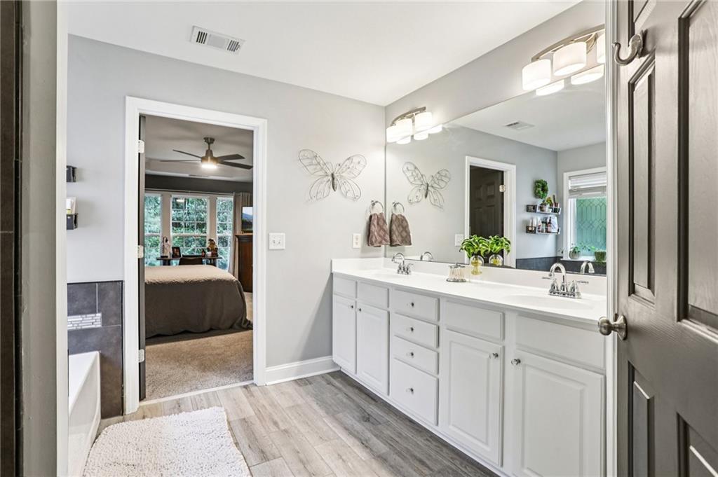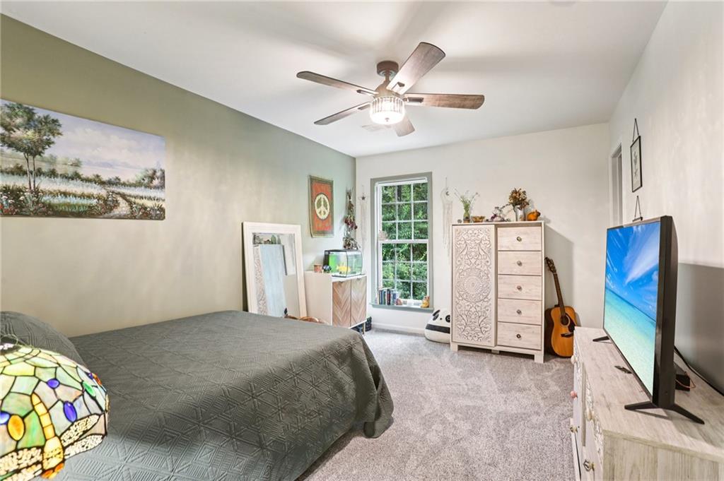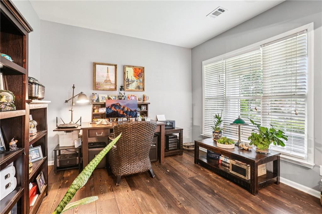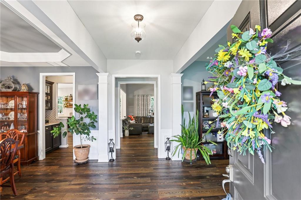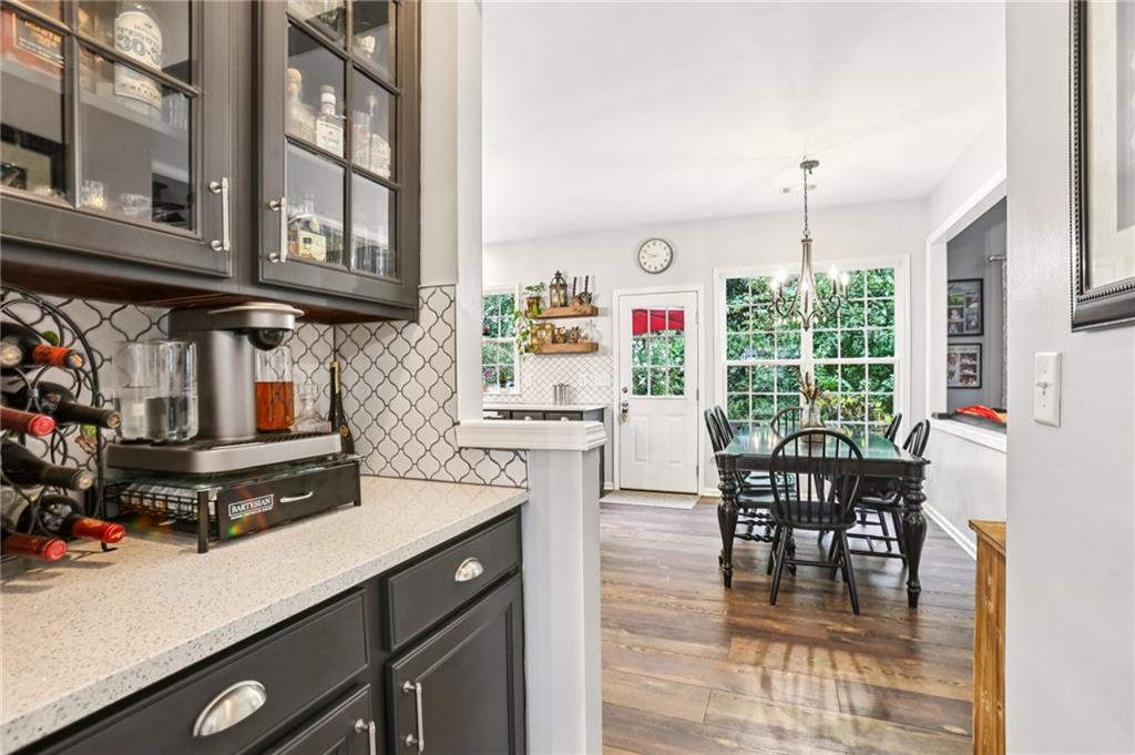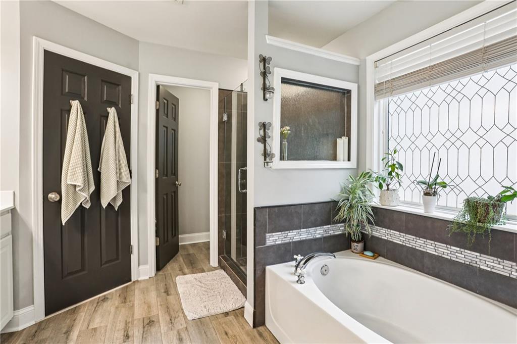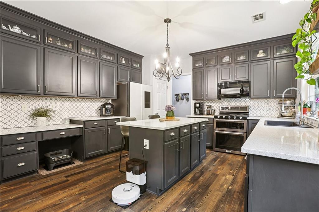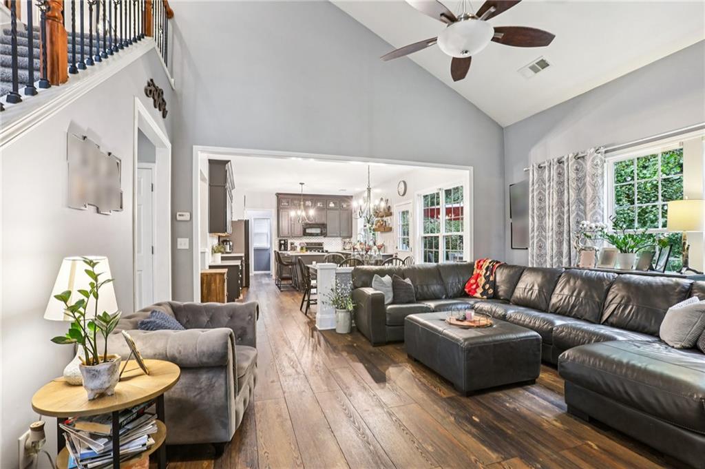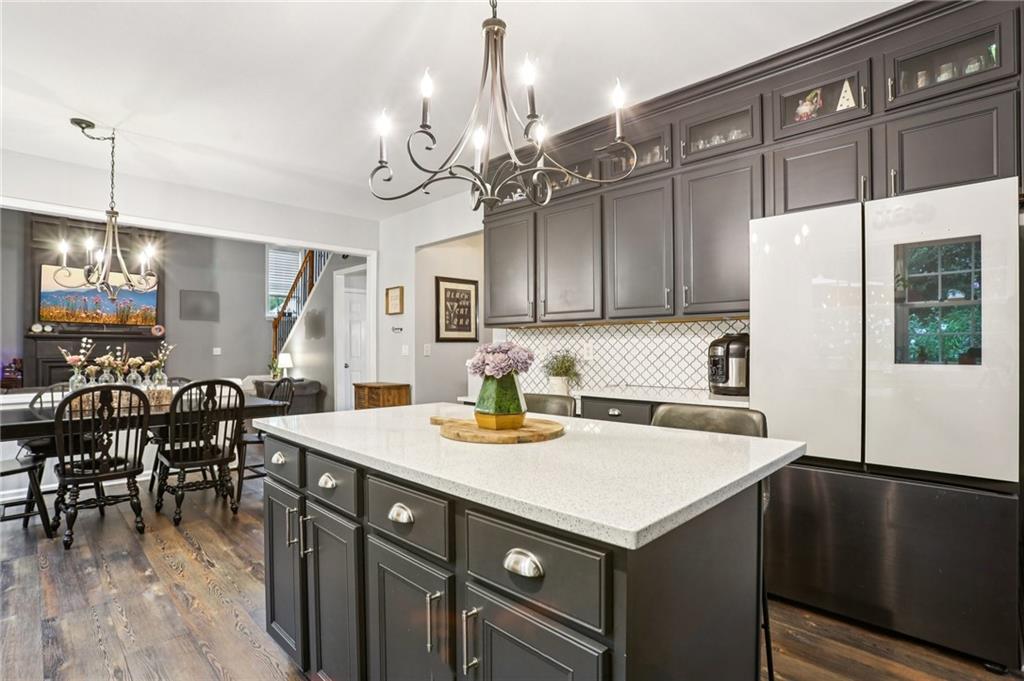 This awesome home in the South Forsyth district has SO many things to love: Popular open floor plan, lots of great upgrades, and a beautiful private back yard! Main floor includes a formal dining room, front living room/office space, open family room with fireplace and high ceiling, and a spacious updated kitchen with quartz counters, decorative tile backsplash, double oven, and custom upper cabinets for extra storage. Lots of windows and natural light! Primary suite upstairs features an updated bathroom with tiled shower and separate tub and large closet with handy built-ins. Three additional bedrooms on the second floor, all with walk-in closets! Newer LVP flooring on main and carpet/pad has been recently replaced upstairs. Roof replaced in 2021! Beautiful private fenced backyard with level grassy area, storage shed, and lots of flowering trees and shrubs. Oversized stamped concrete patio has plenty of room for grilling and entertaining with room for multiple seating areas. HOA includes swim and tennis.