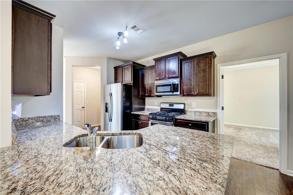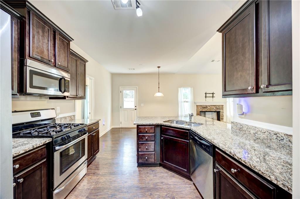 - KitchenBreakfast Room, Cabinets Stain, Pantry, Stone Counters, View to Family Room