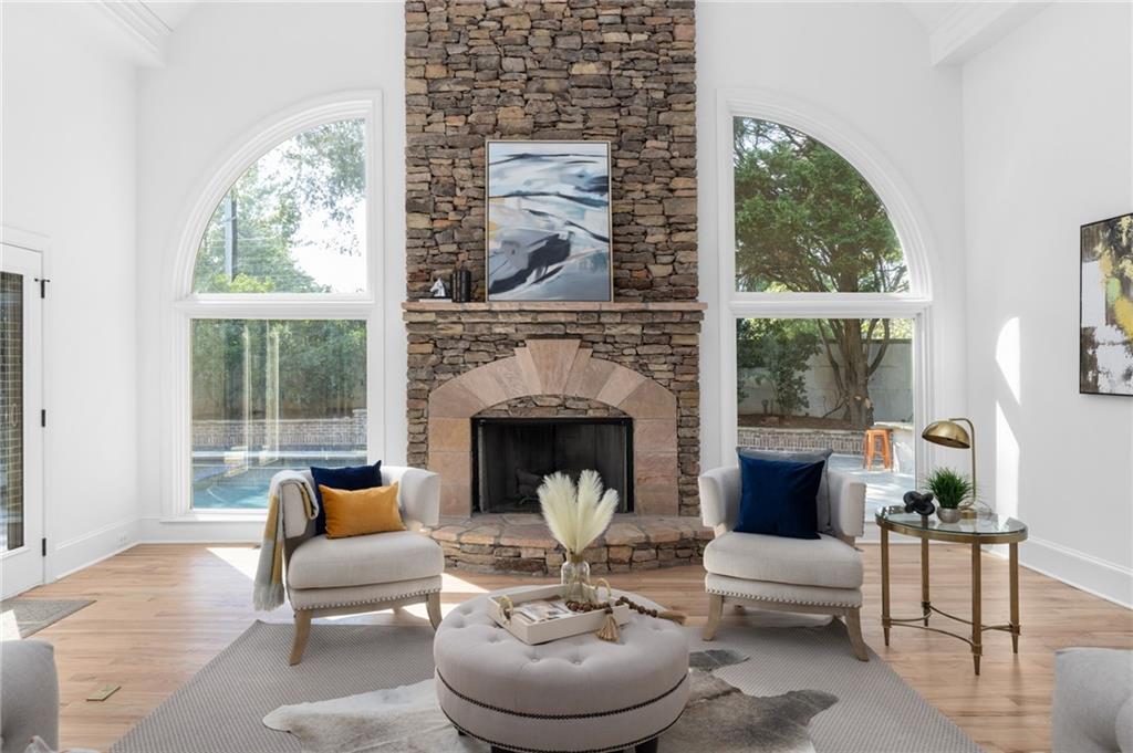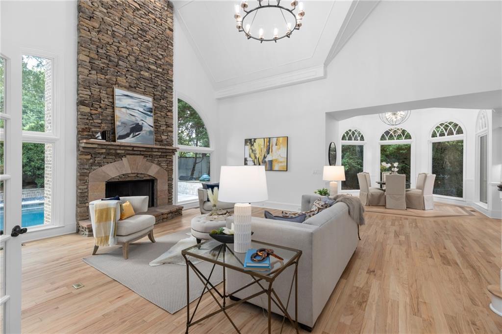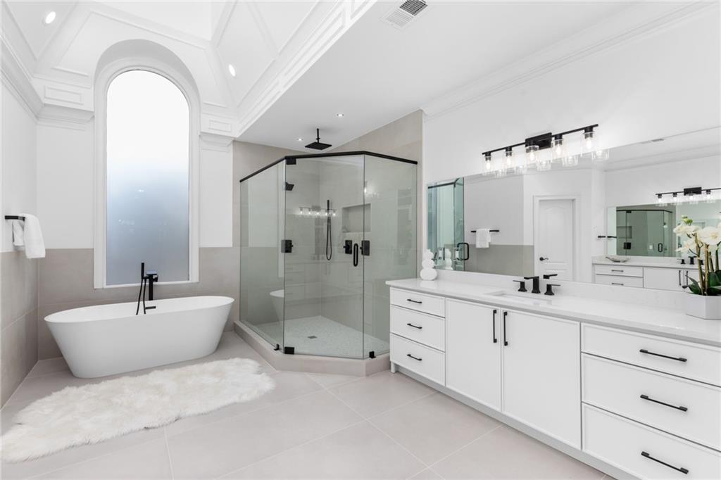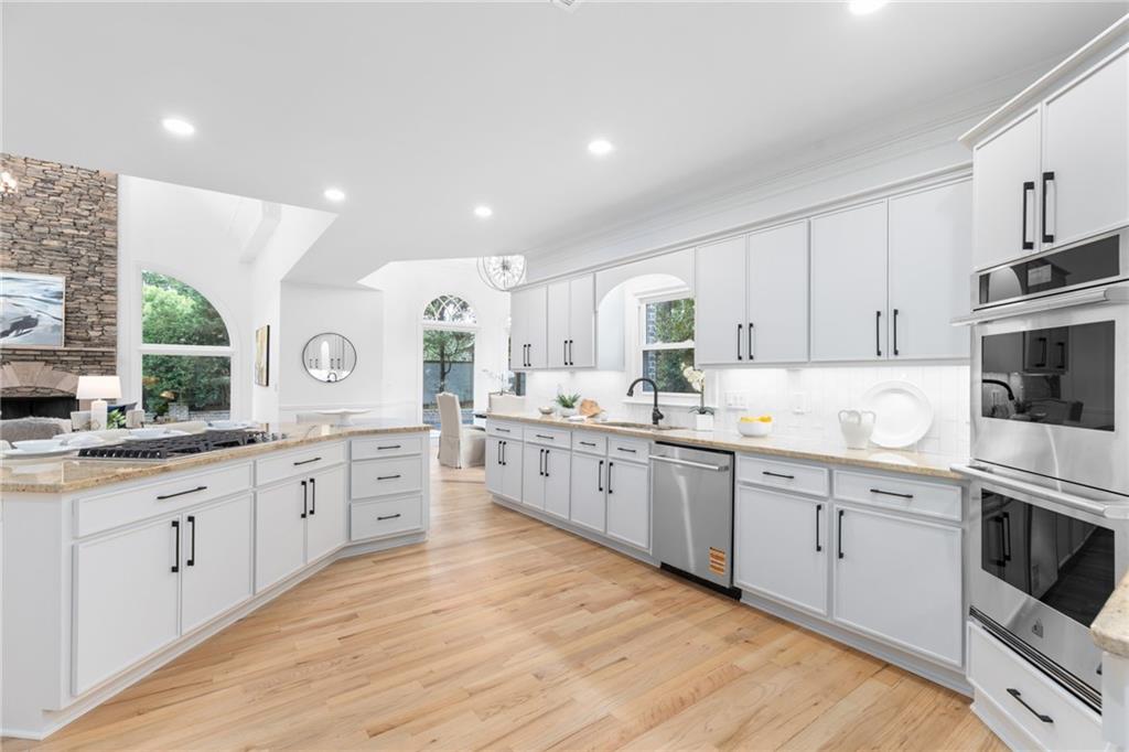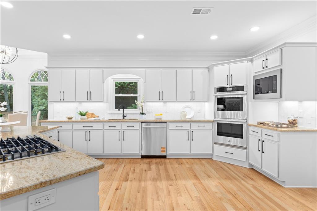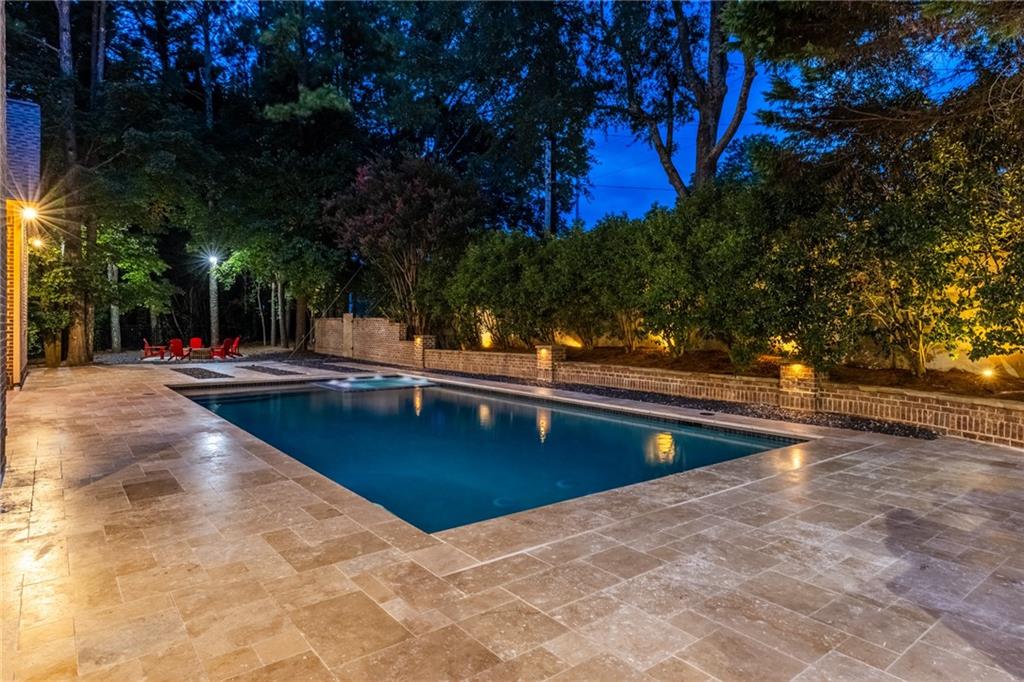This stunning four-sided brick home is located in the Saint Ives gated country club community in the heart of Johns Creek and is walking distance from Johns Creek High School. The house has completed a three-level major renovation on 8/29/25, featuring a new master bathroom; a new kitchen with all new stainless-steel appliances; all new light fixtures, chandeliers, and recessed lighting throughout the home; newly refinished contemporary hardwoods; and an entirely repainted interior; among numerous other upgrades. The back of the home opens to a beautifully maintained brick patio with an outdoor fireplace and a spacious travertine pool deck, perfect for entertaining, and features a large, heated salt water PebbleTec pool with built-in spa and smartphone controls, as well as an outdoor grilling station with a Brahma Bull natural gas grill, a smoker, and a separate fire pit. The home comprises a total of 7 bedrooms with master suite on main, 6 full bathrooms, 1 half bath, and an exceptionally large, finished daylight basement complete with a kitchenette and full bar. The main level includes a separate formal dining room, a spacious home office, and a two-story renovated foyer with new custom front doors that open to a magnificent family room with one of the two indoor fireplaces. The open layout of this space is ideal for entertaining, as the kitchen space flows into the keeping room and breakfast area, from which there is a full view to the pool in the backyard for when the gathering spills out into the beautifully maintained and recently renovated back patio and pool deck. The main level is bright and bathed in sunlight. The water-based light hardwood flooring extends from the main level to the upper level, which houses four additional bedrooms and bathrooms. The terrace level showcases beautiful travertine marble flooring and includes 2 additional spacious bedrooms, a home theater room, a gym, a family room, a dance studio with lights and mirrors, a bonus room, and a workshop/additional storage area. Every element of the physical plant of the house contains either brand new hardware or has been replaced within the past five years. The roof is two years old with architectural shingles and a 25-year transferrable warranty. A preemptive home inspection was commissioned at the end of the renovation and minor issues detected were all addressed, including installation of a new 70-gallon Energy Star certified water heater.