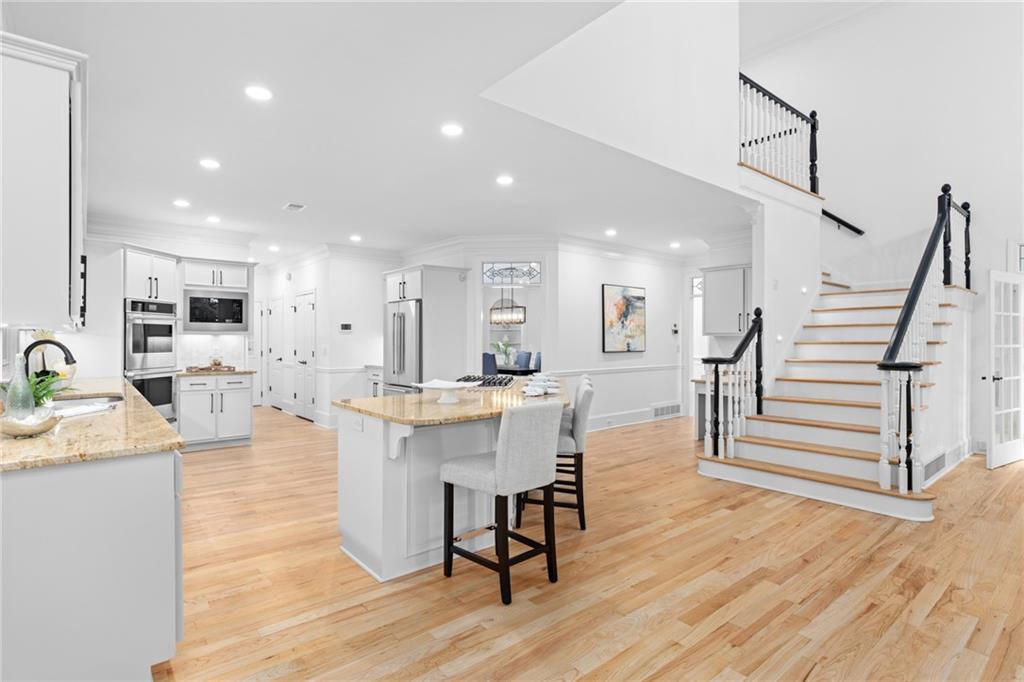- KitchenBreakfast Bar, Breakfast Room, Cabinets White, Pantry Walk-In, Second Kitchen, Stone Counters, View to Family Room