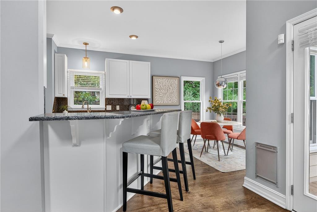- KitchenBreakfast Bar, Cabinets White, Eat-in Kitchen, Pantry, Stone Counters, View to Family Room
