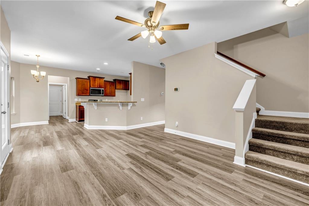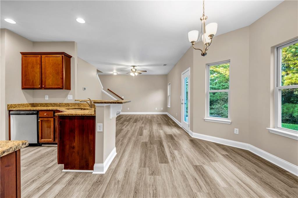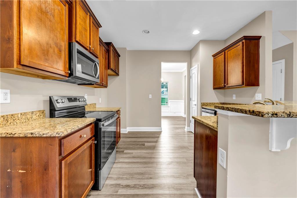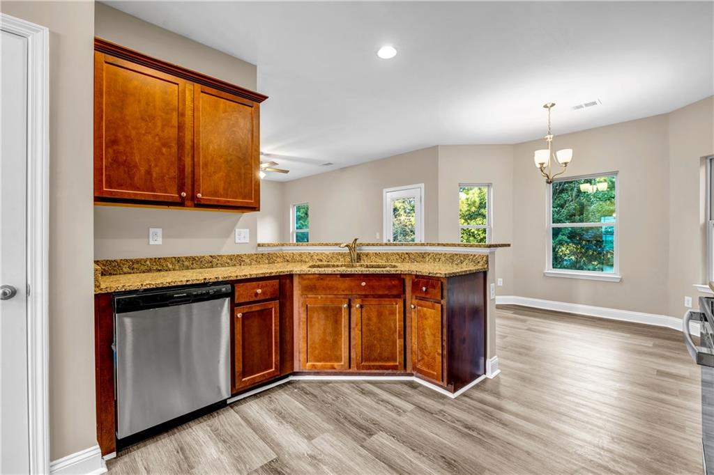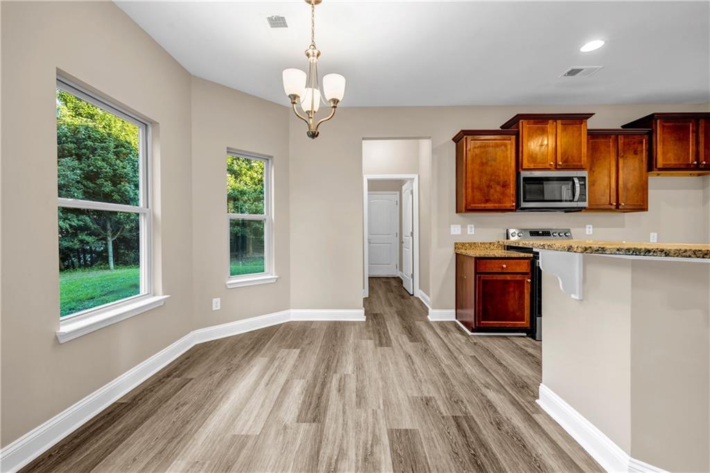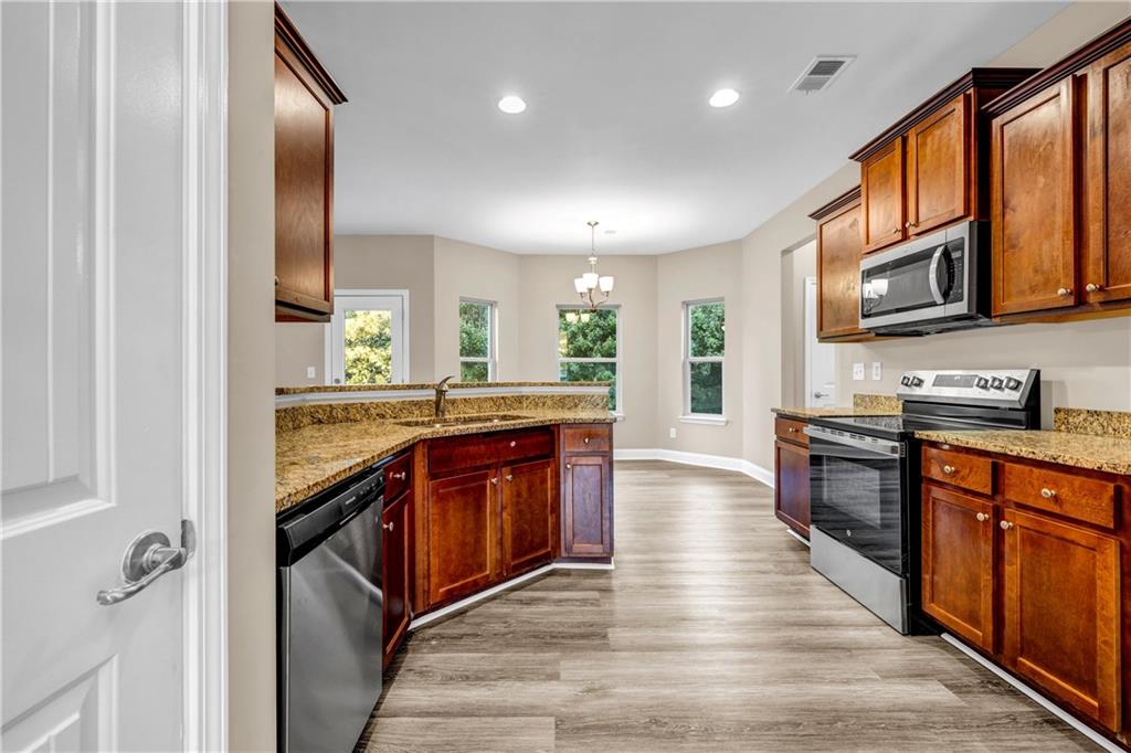 - KitchenBreakfast Bar, Breakfast Room, Cabinets Other, Cabinets Stain, Eat-in Kitchen, Pantry, Stone Counters, View to Family Room
