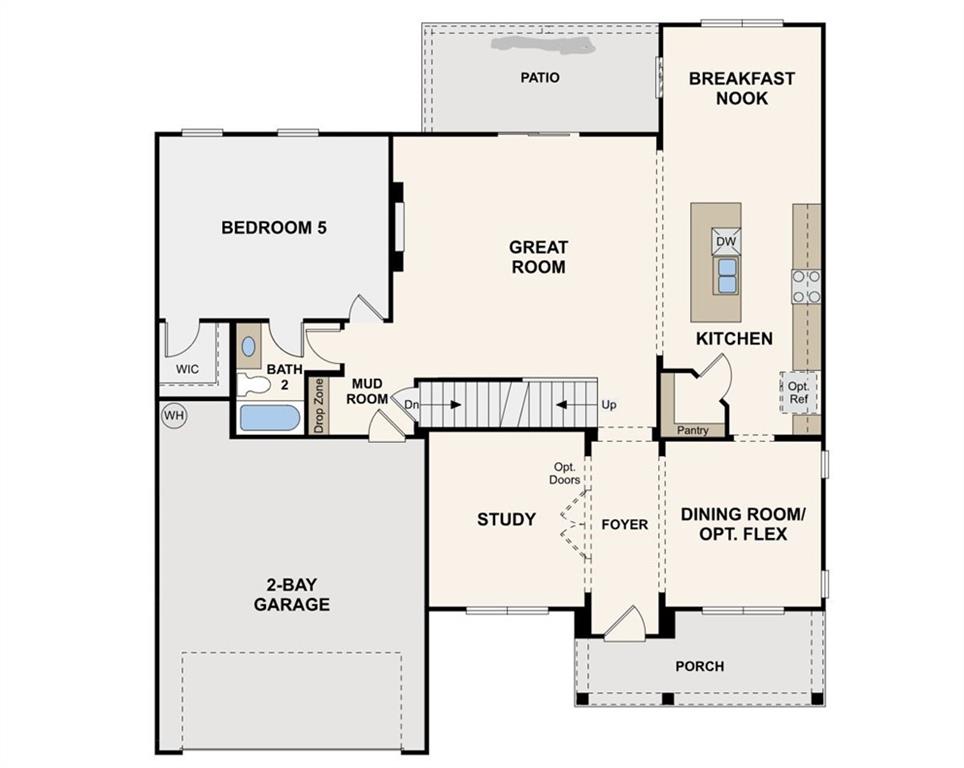 The Sapling is a stunning 5-bedroom, 4-bathroom two-story home, designed with spacious, open-concept living in mind. The main level welcomes you with a formal dining room, a private study, and a large kitchen featuring ample cabinetry, expansive countertops, a sunny breakfast area, and a walk-in pantry. The great room, complete with a cozy fireplace, offers a perfect gathering space. Conveniently, there’s a guest bedroom with access to a full bath located just off the garage entry. Upstairs, the primary suite impresses with a separate double vanity, soaking tub, walk-in shower, and a generous walk-in closet. Two secondary bedrooms share a Jack-and-Jill bath, each with its own vanity, while a third bedroom enjoys a private ensuite bath and large walk-in closet. A spacious loft and a well-equipped laundry room complete the second level, offering both functionality and style throughout. Elevate your lifestyle with the Sapling floorplan at Ellorie Estates - where there is a home for every dream!