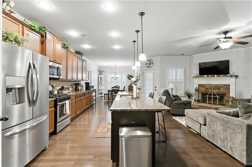 - KitchenBreakfast Bar, Cabinets Stain, Pantry Walk-In, Stone Counters, View to Family Room
