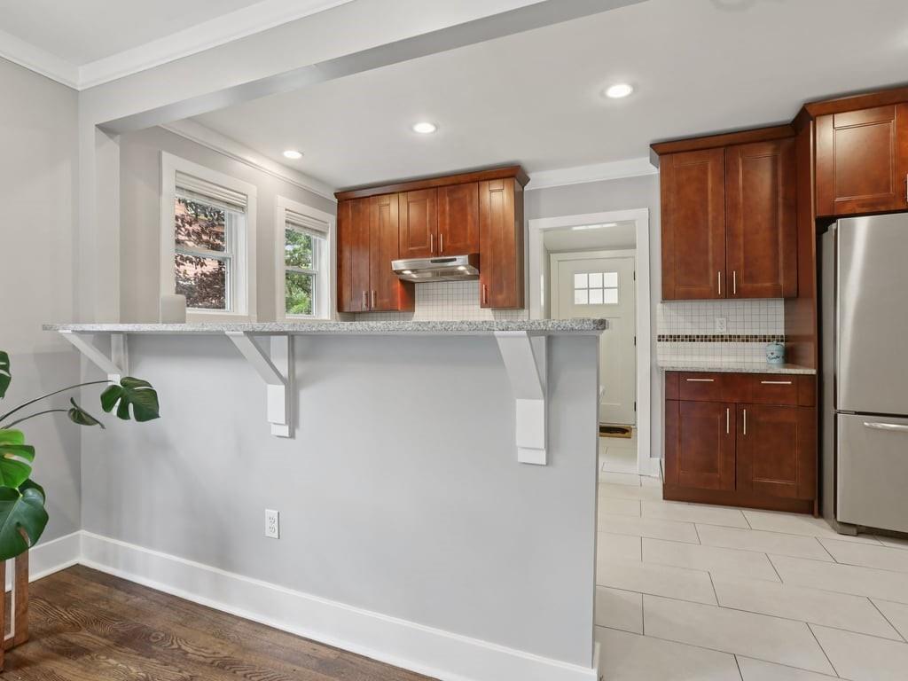 - KitchenBreakfast Bar, Cabinets Stain, Pantry, Stone Counters, View to Family Room