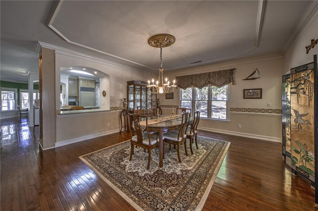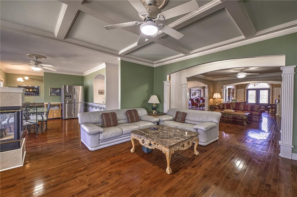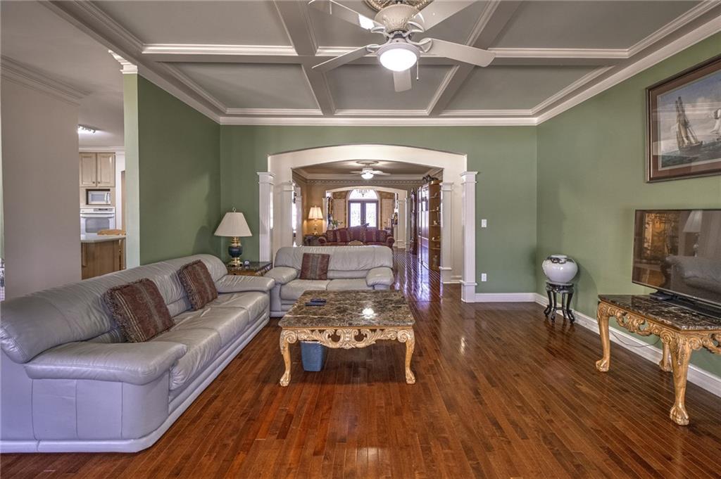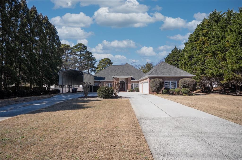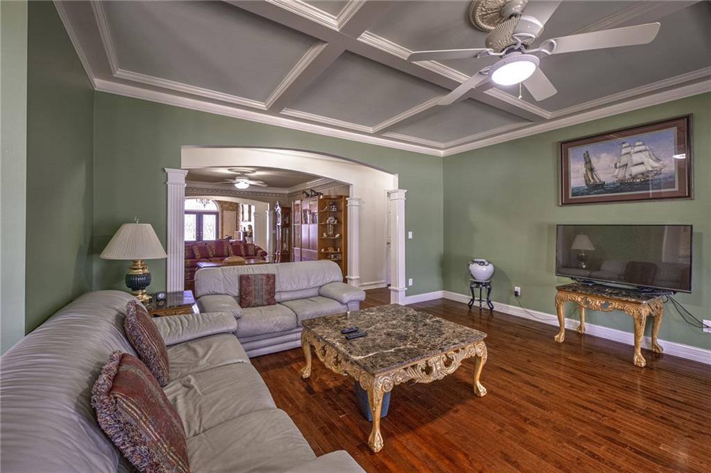This exquisite custom ranch home offers an expansive and open floor plan, boasting over 3,500 square feet of living space on a single level. The residence features elegant hardwood floors and detailed crown molding throughout, enhancing its luxurious feel. The arched entryways provide a stately introduction to the various rooms. The large living room is highlighted by coffered ceilings, providing an air of sophistication, and is adjoined by a formal dining room, perfect for hosting elegant dinners. The gourmet kitchen is a chef's dream, equipped with a custom built-in refrigerator, a large center island, a walk-in pantry, a breakfast bar, and a separate eating area. The oversized master suite is a private retreat, featuring an ensuite bathroom that includes double vanities, a separate shower, a soaking tub, and a spacious walk-in closet. The home also includes two additional large secondary bedrooms connected by a Jack and Jill bathroom, offering both comfort and convenience. The exterior is equally impressive, with a beautifully landscaped lot spanning over half an acre. The U-shaped driveway provides ample parking space, including additional parking for RV storage with easy access. This is a rare opportunity to own a meticulously designed and maintained custom home. Do not miss out on this gem—schedule your showing today.