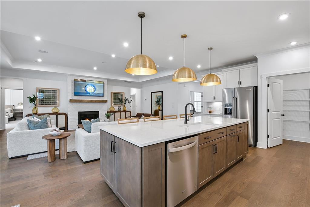 - KitchenEat-in Kitchen, Kitchen Island, Pantry Walk-In, Stone Counters, View to Family Room