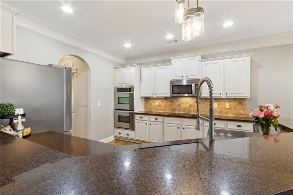 - KitchenBreakfast Bar, Breakfast Room, Cabinets White, Eat-in Kitchen, Pantry Walk-In, Stone Counters, View to Family Room