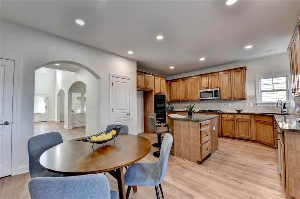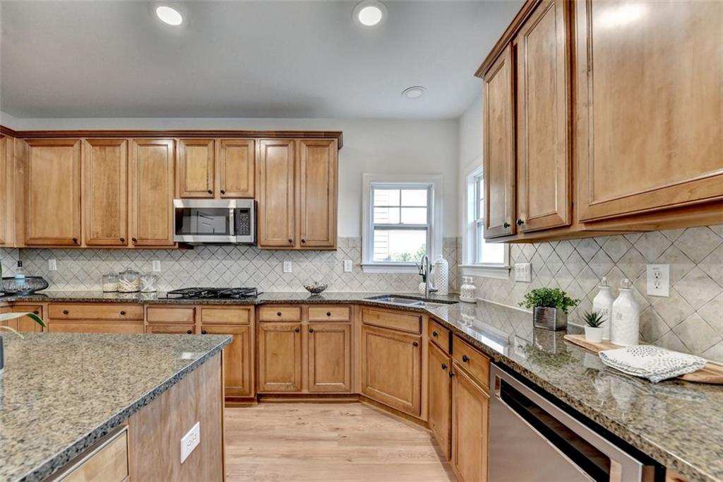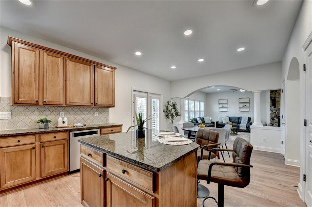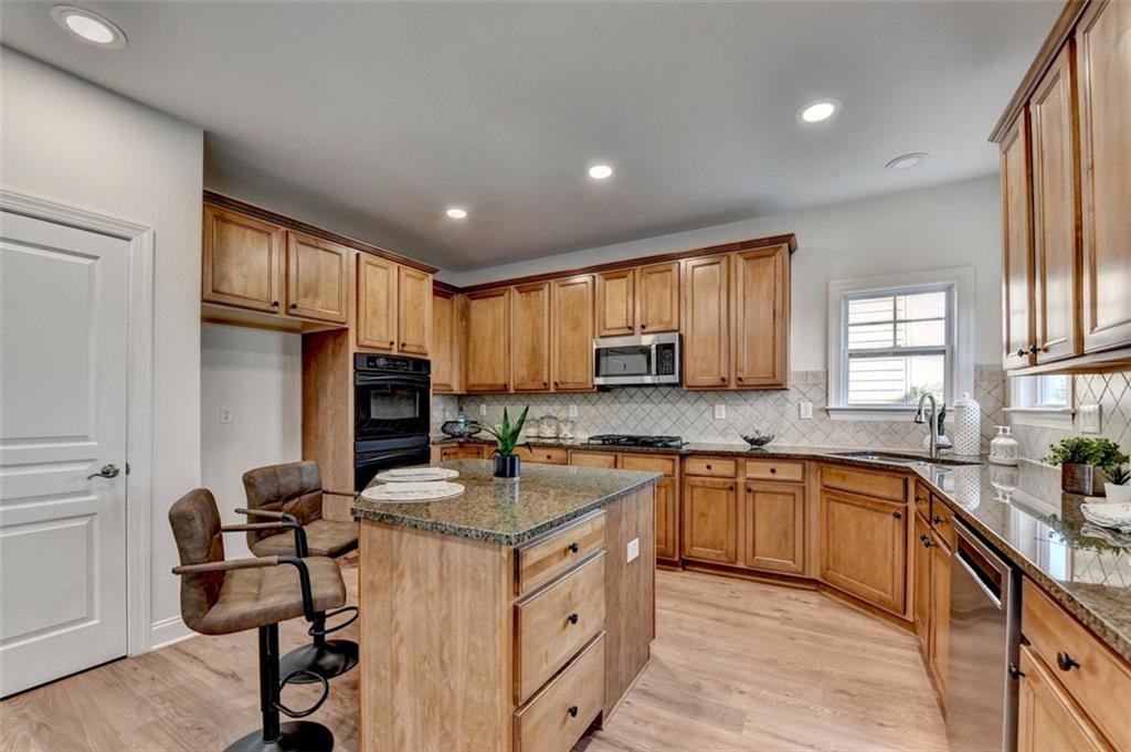 - KitchenCabinets Stain, Solid Surface Counters, Kitchen Island, Pantry, View to Family Room