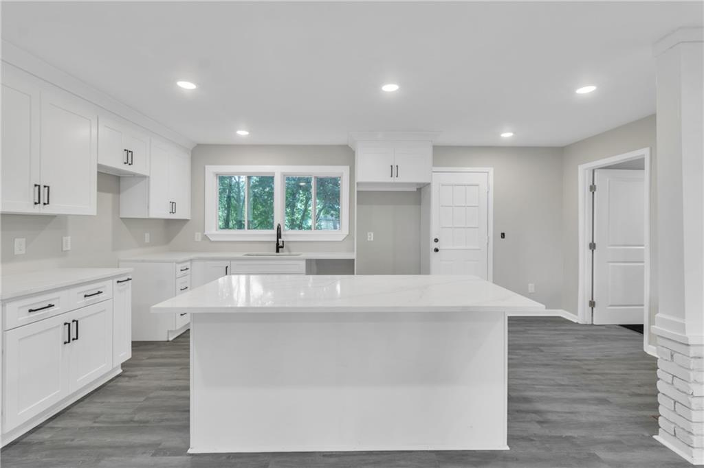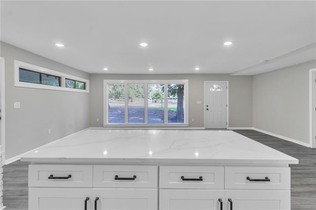 - KitchenCabinets White, Kitchen Island, Solid Surface Counters, View to Family Room