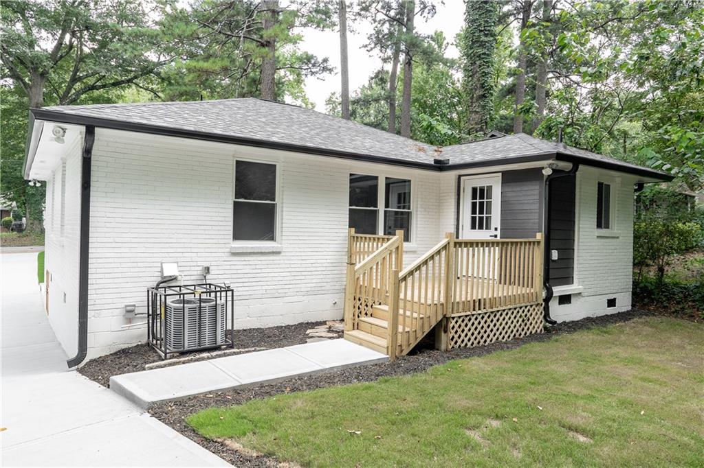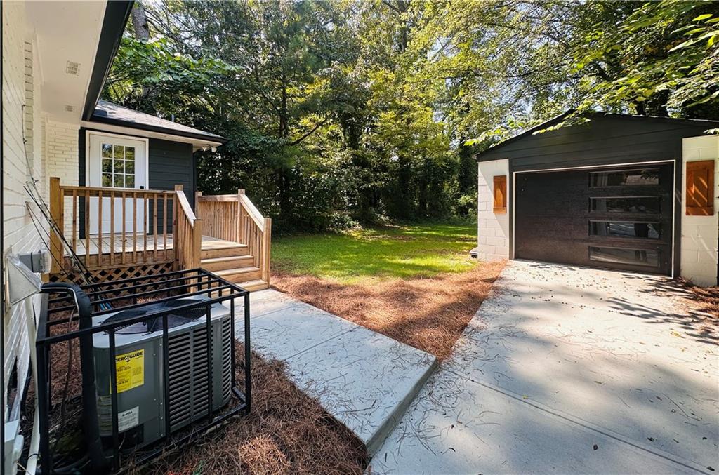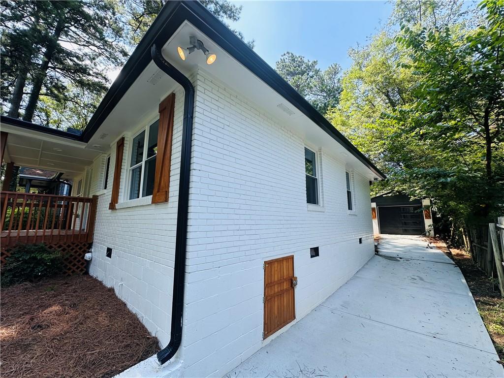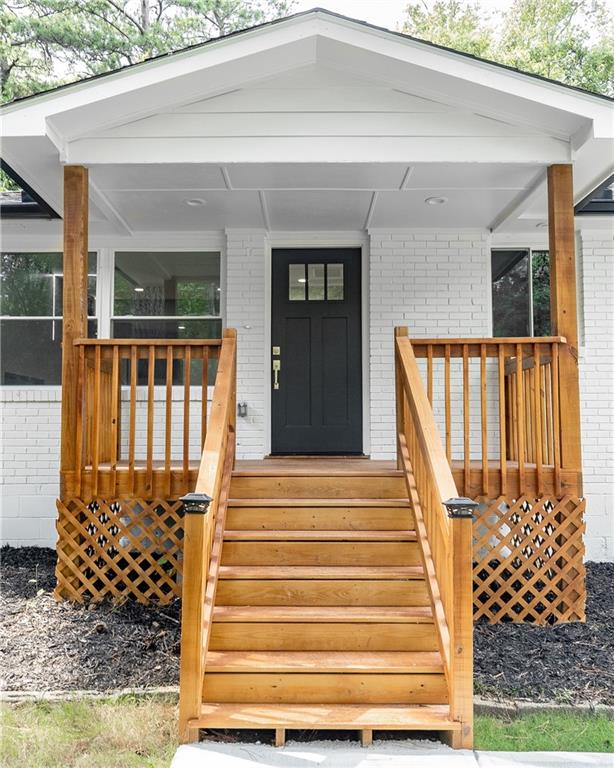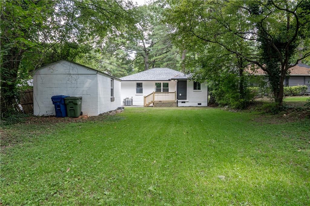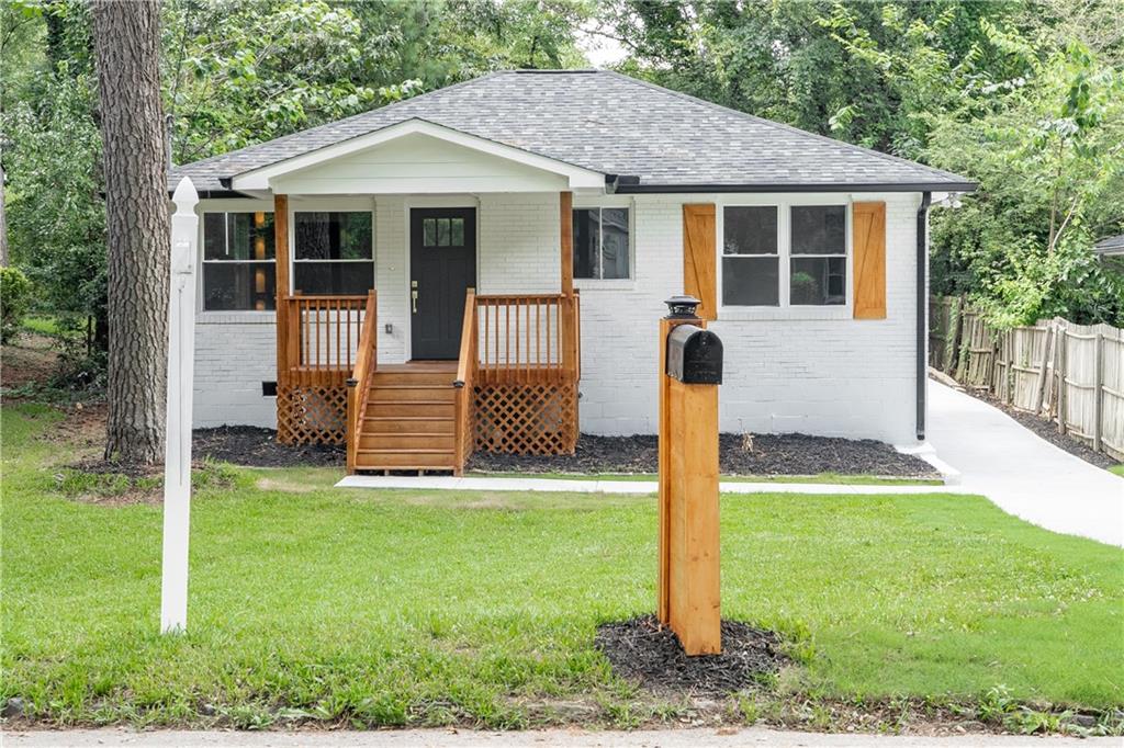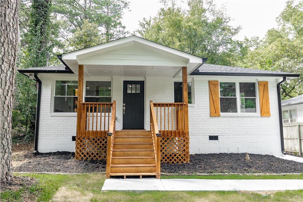 Welcome to this beautifully remodeled brick ranch that seamlessly blends modern design with classic appeal. From the moment you arrive, the stained, covered rocking chair front porch invites you to slow down and enjoy the charm of this thoughtfully updated home. Step inside to find gleaming hardwood floors and an open concept family room featuring a custom modern lighted accent wall, corner shelving, and an electric fireplace that sets the tone for cozy evenings and stylish living. The adjoining kitchen is a true showstopper boasting stainless steel appliances including a sleek vent hood, and a dramatic marble-inspired tile backsplash that extends from counter to ceiling. Sleek cabinetry and quartz countertops deliver a clean, modern aesthetic with just the right touch of traditional warmth. The primary suite features a beautifully updated bath with vertical subway tile. A trendy yet timeless design choice. Two additional secondary bedrooms and another full bath offer ample space, all updated with contemporary vanities, fixtures, and finishes. Outside, enjoy the new deck and extended concrete pad, perfect for parking or entertaining with wooded and private views. A detached garage offers even more storage and flexibility. With no HOA, you’ll enjoy the freedom to personalize your property as you see fit. Conveniently located near major highways, healthcare, top-rated schools, dining, shopping, and year-round entertainment. Just minutes from Mercedes-Benz Stadium, and Hartsfield-Jackson ATL Airport. This home checks every box for comfort, style, and location. Move-in ready and waiting for you!