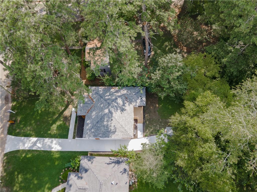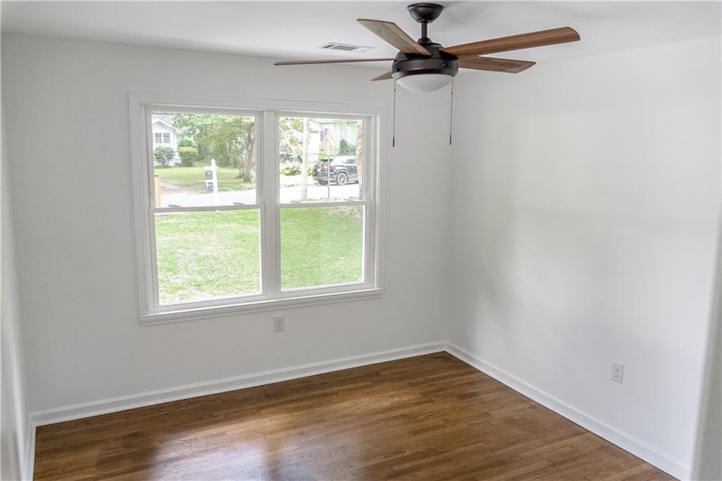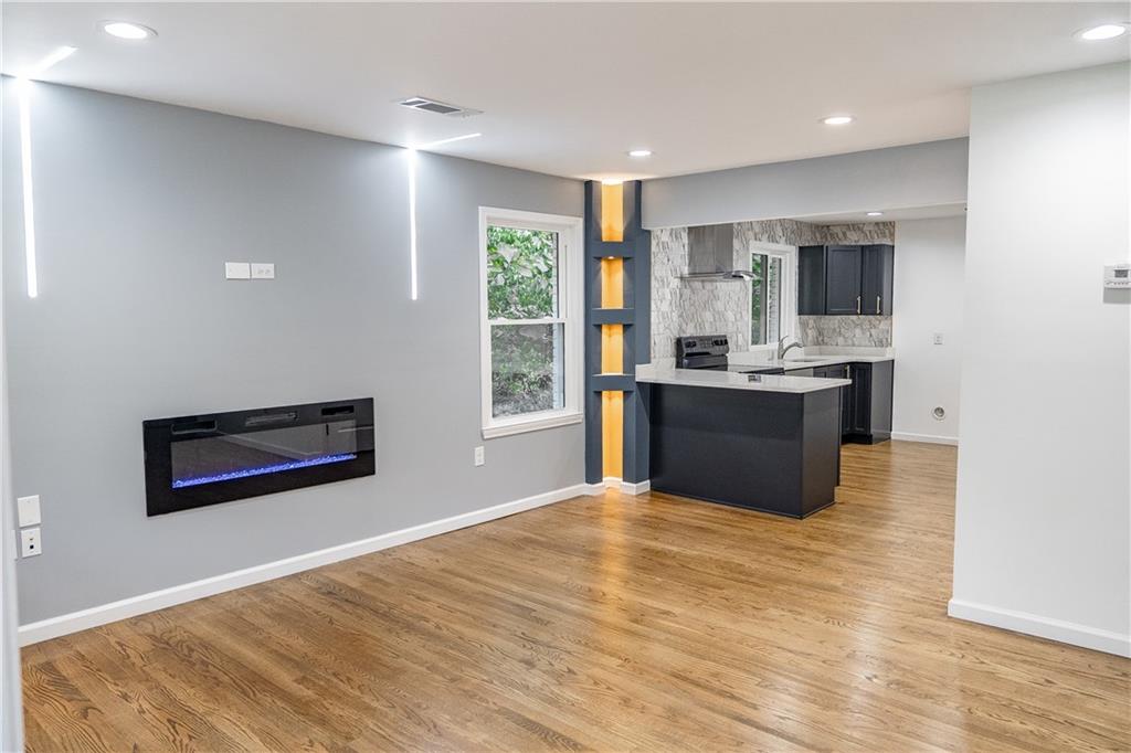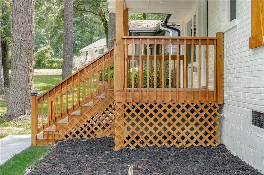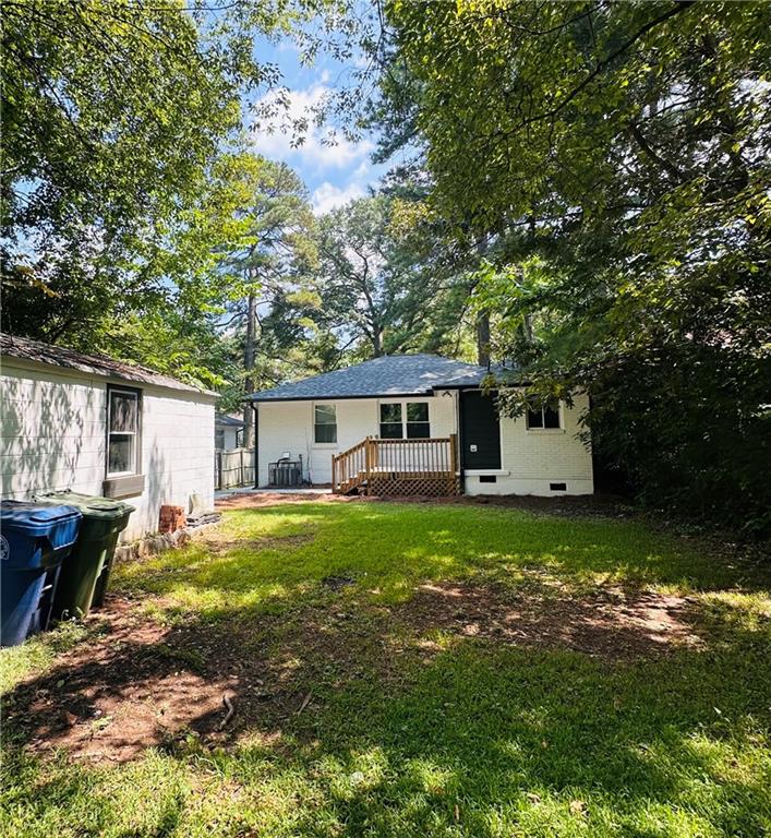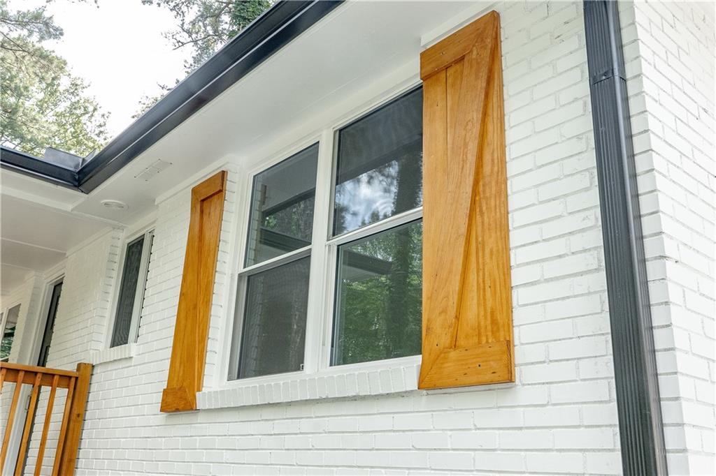 Welcome to this beautifully remodeled brick ranch that seamlessly blends modern design with classic appeal. From the moment you arrive, the stained, covered rocking chair front porch invites you to slow down and enjoy the charm of this thoughtfully updated home. Step inside to find gleaming hardwood floors and an open concept family room featuring a custom modern lighted accent wall, corner shelving, and an electric fireplace that sets the tone for cozy evenings and stylish living. The adjoining kitchen is a true showstopper boasting stainless steel appliances including a sleek vent hood, and a dramatic marble-inspired tile backsplash that extends from counter to ceiling. Sleek cabinetry and quartz countertops deliver a clean, modern aesthetic with just the right touch of traditional warmth. The primary suite features a beautifully updated bath with vertical subway tile. A trendy yet timeless design choice. Two additional secondary bedrooms and another full bath offer ample space, all updated with contemporary vanities, fixtures, and finishes. Outside, enjoy the new deck and extended concrete pad, perfect for parking or entertaining with wooded and private views. A detached garage offers even more storage and flexibility. With no HOA, you’ll enjoy the freedom to personalize your property as you see fit. Conveniently located near major highways, healthcare, top-rated schools, dining, shopping, and year-round entertainment. Just minutes from Mercedes-Benz Stadium, and Hartsfield-Jackson ATL Airport. This home checks every box for comfort, style, and location. Move-in ready and waiting for you!