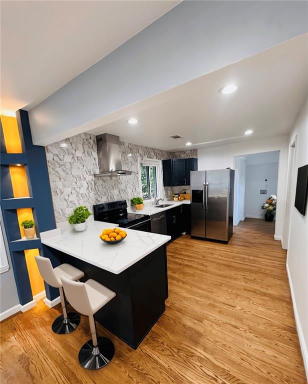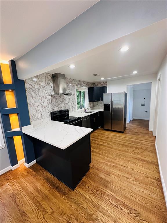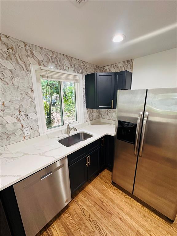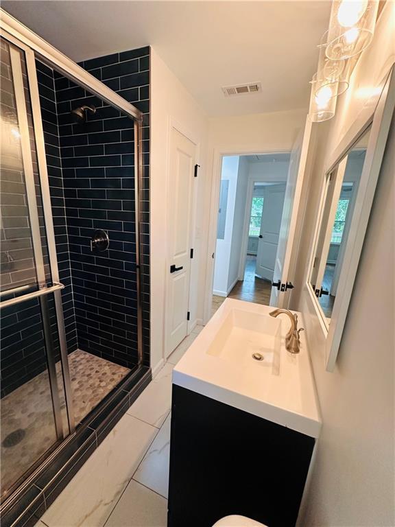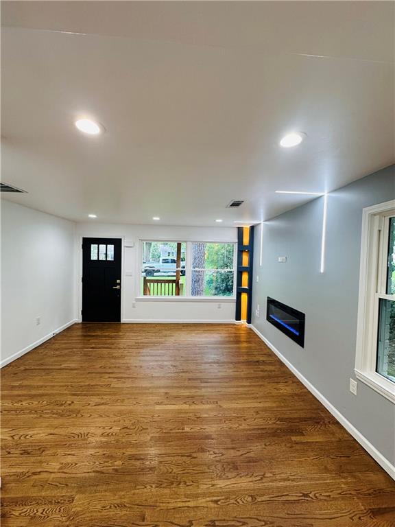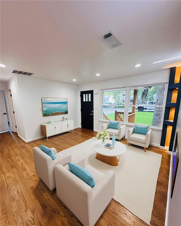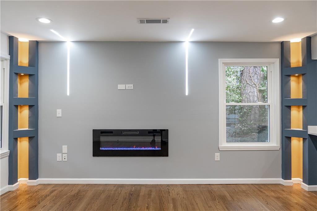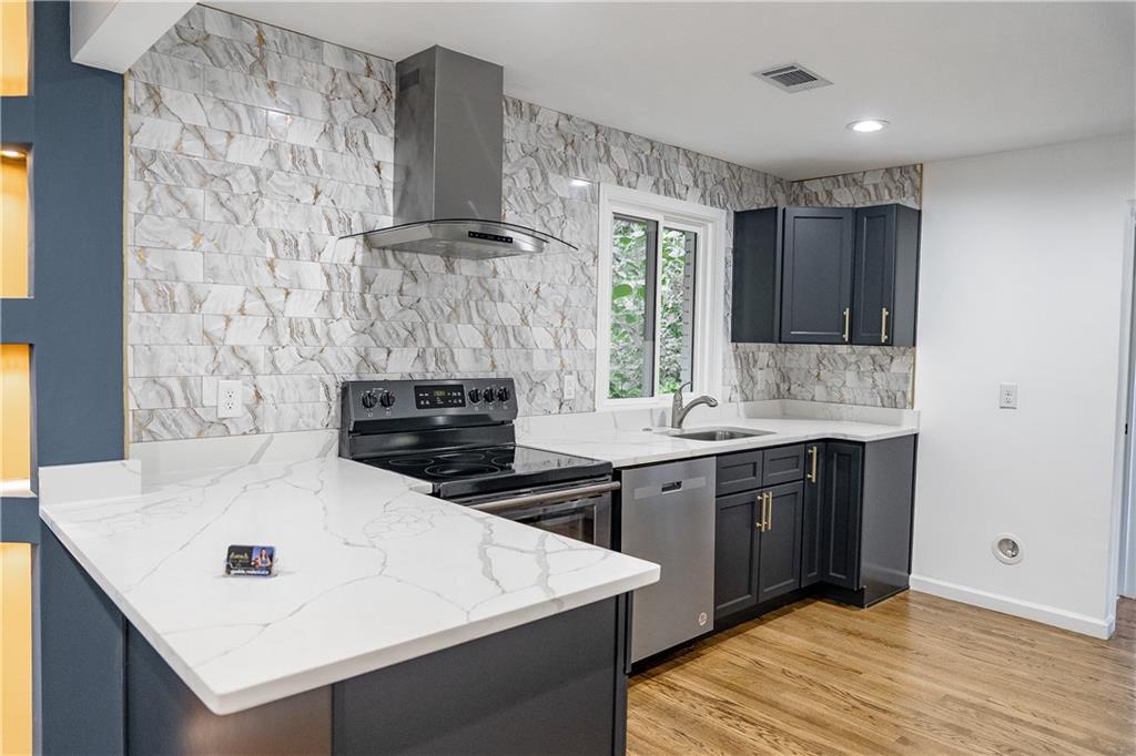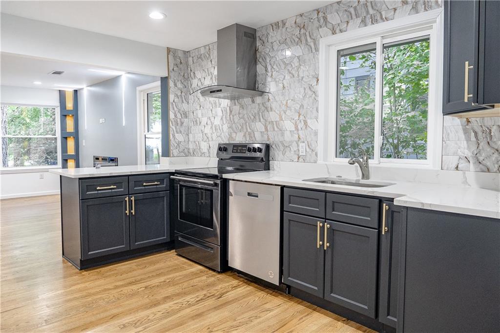Welcome to this beautifully remodeled brick ranch that seamlessly blends modern design with classic appeal. From the moment you arrive, the stained, covered rocking chair front porch invites you to slow down and enjoy the charm of this thoughtfully updated home. Step inside to find gleaming hardwood floors and an open concept family room featuring a custom modern lighted accent wall, corner shelving, and an electric fireplace that sets the tone for cozy evenings and stylish living. The adjoining kitchen is a true showstopper boasting stainless steel appliances including a sleek vent hood, and a dramatic marble-inspired tile backsplash that extends from counter to ceiling. Sleek cabinetry and quartz countertops deliver a clean, modern aesthetic with just the right touch of traditional warmth. The primary suite features a beautifully updated bath with vertical subway tile. A trendy yet timeless design choice. Two additional secondary bedrooms and another full bath offer ample space, all updated with contemporary vanities, fixtures, and finishes. Outside, enjoy the new deck and extended concrete pad, perfect for parking or entertaining with wooded and private views. A detached garage offers even more storage and flexibility. With no HOA, you’ll enjoy the freedom to personalize your property as you see fit. Conveniently located near major highways, healthcare, top-rated schools, dining, shopping, and year-round entertainment. Just minutes from Mercedes-Benz Stadium, and Hartsfield-Jackson ATL Airport. This home checks every box for comfort, style, and location. Move-in ready and waiting for you!