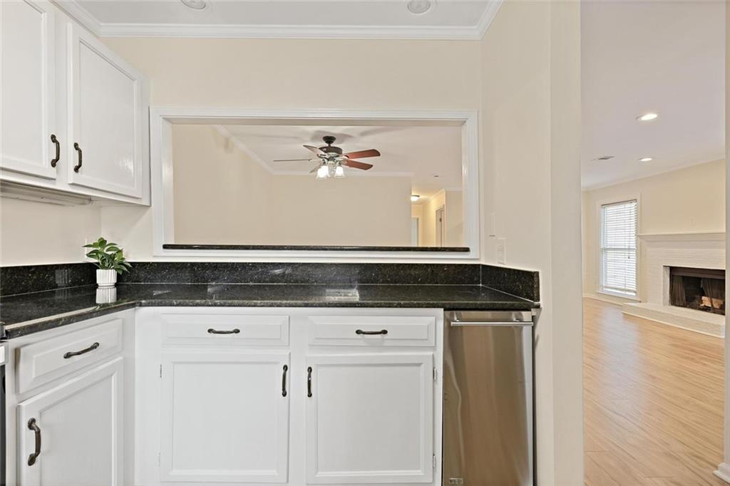 - KitchenBreakfast Bar, Cabinets White, Pantry, Solid Surface Counters, View to Family Room
