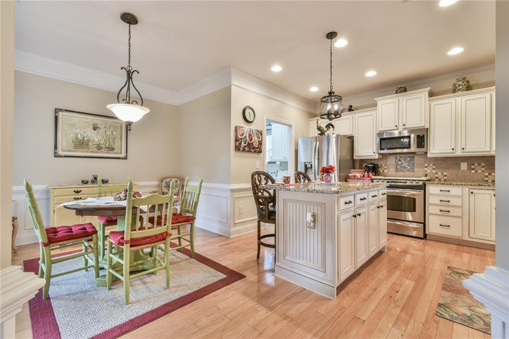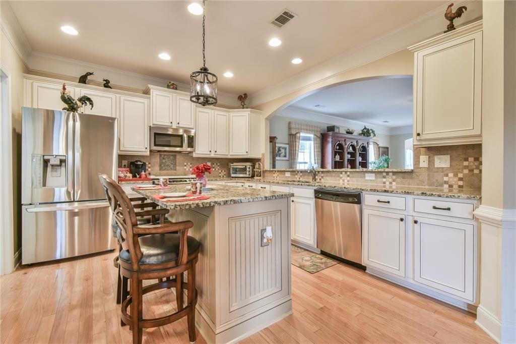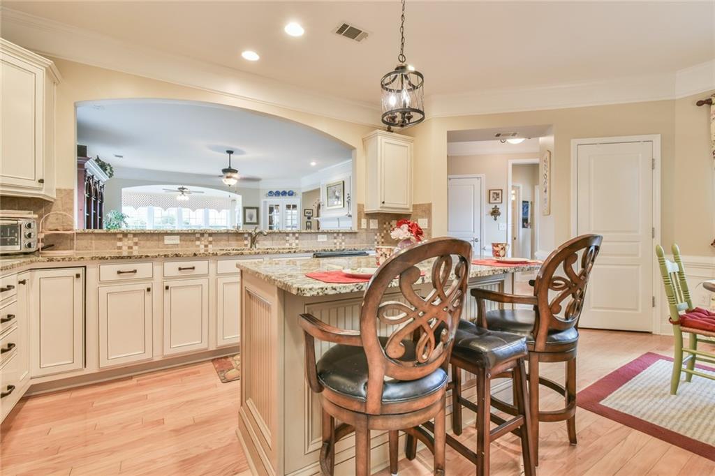 - KitchenBreakfast Bar, Cabinets White, Eat-in Kitchen, Kitchen Island, Stone Counters, View to Family Room
