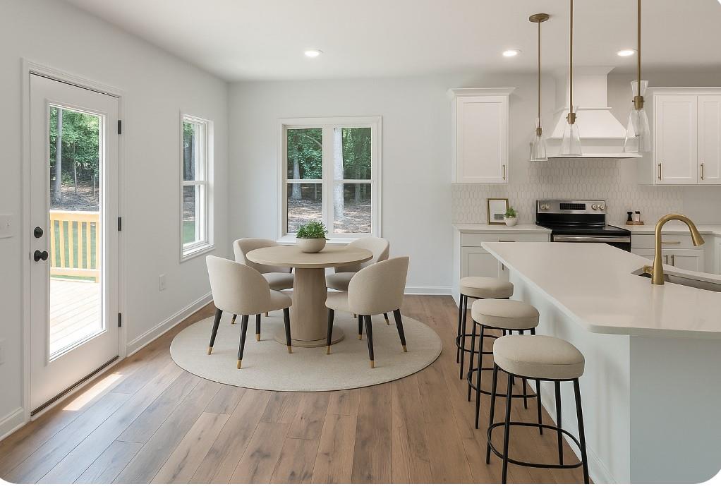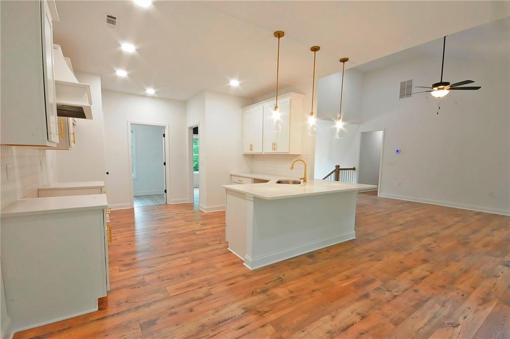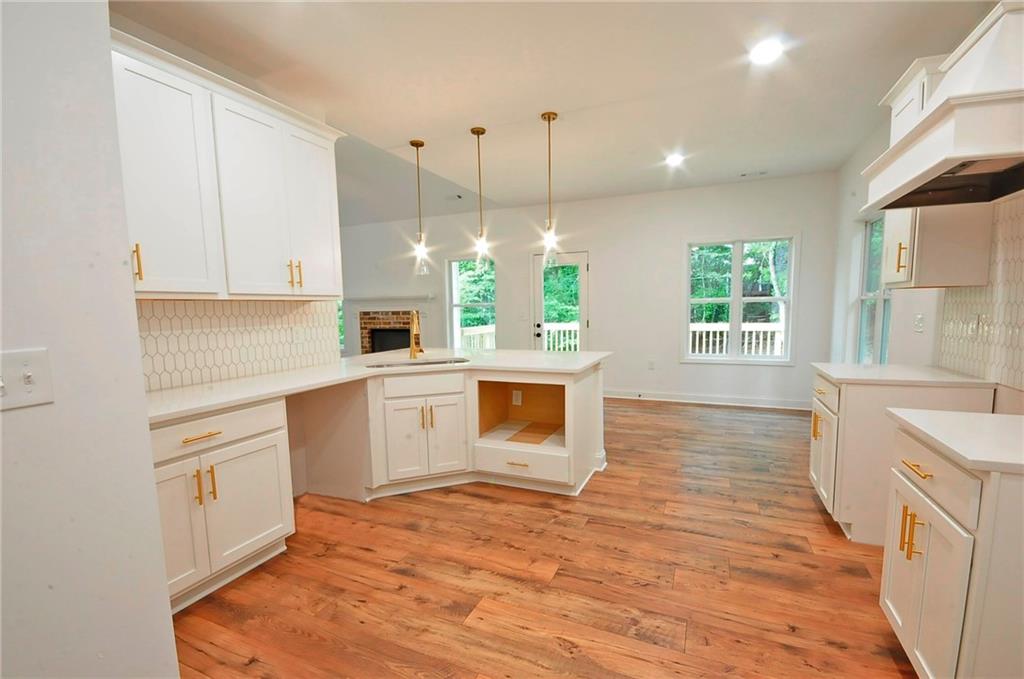 - KitchenCabinets White, Eat-in Kitchen, Pantry, Stone Counters, View to Family Room