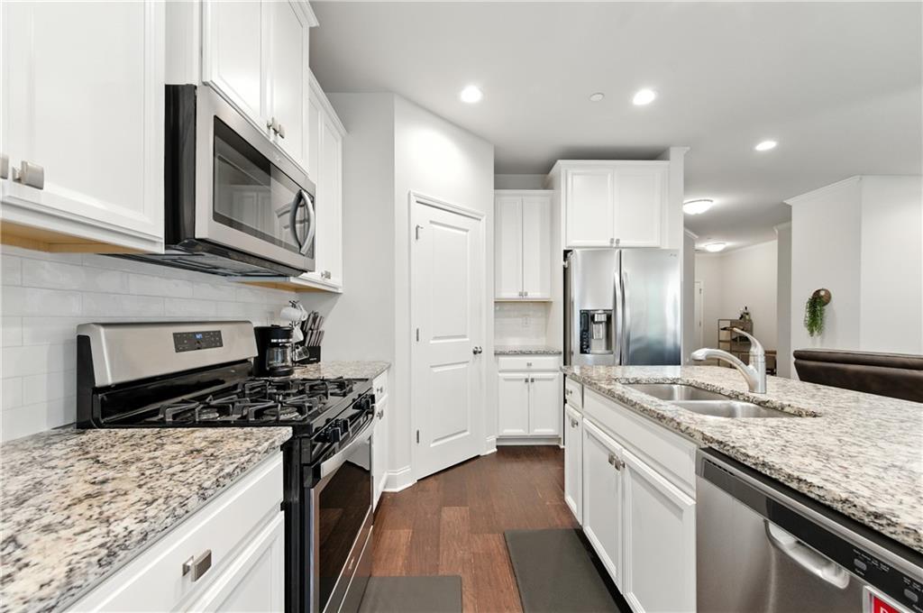 - KitchenBreakfast Bar, Cabinets White, Kitchen Island, Pantry, Stone Counters, View to Family Room