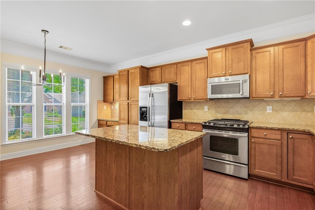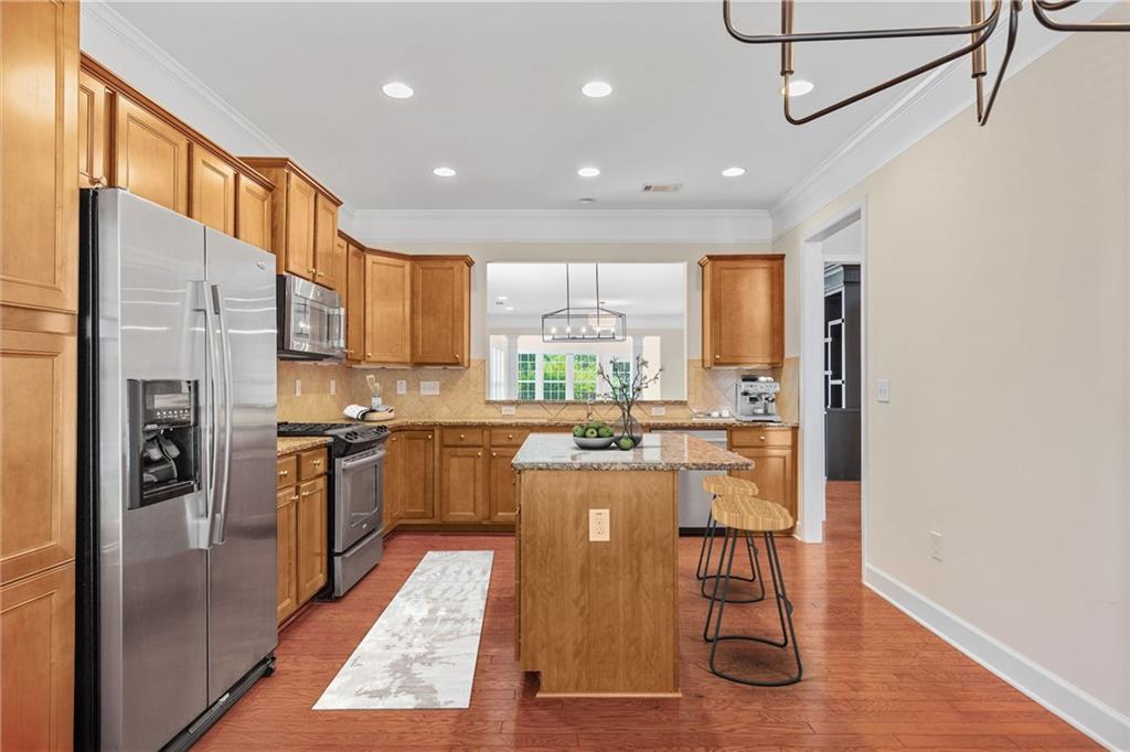 - KitchenBreakfast Bar, Cabinets Stain, Kitchen Island, Pantry, Stone Counters, View to Family Room