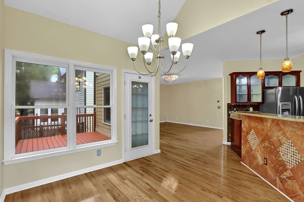 - KitchenBreakfast Room, Cabinets Stain, Eat-in Kitchen, Solid Surface Counters, View to Family Room