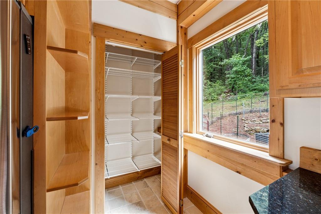 - KitchenBreakfast Bar, Cabinets Stain, Kitchen Island, Pantry, Stone Counters, View to Family Room