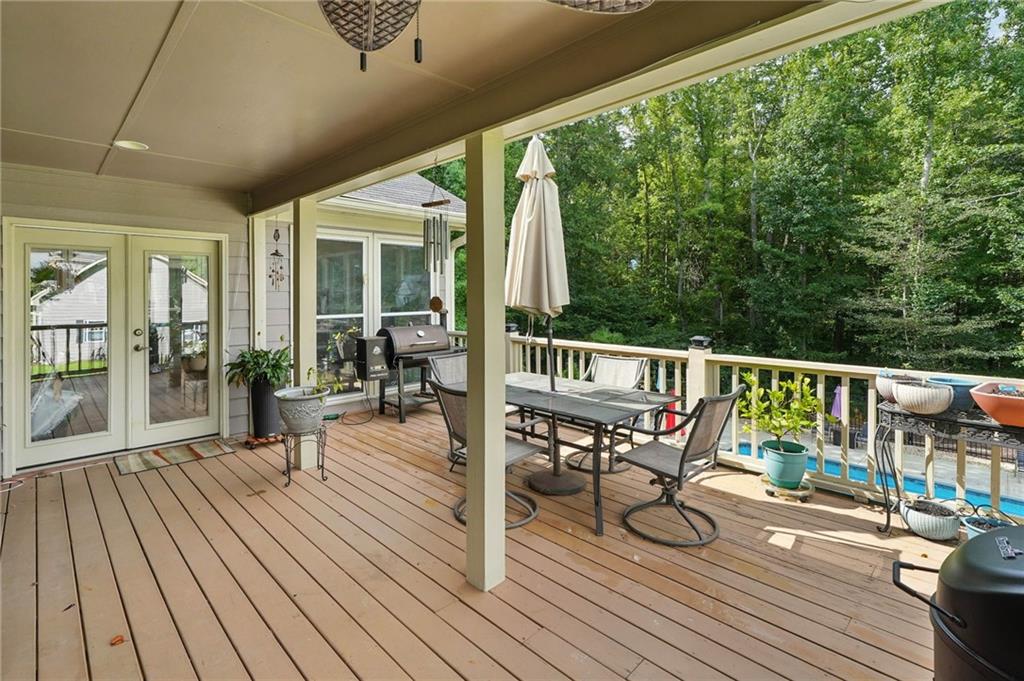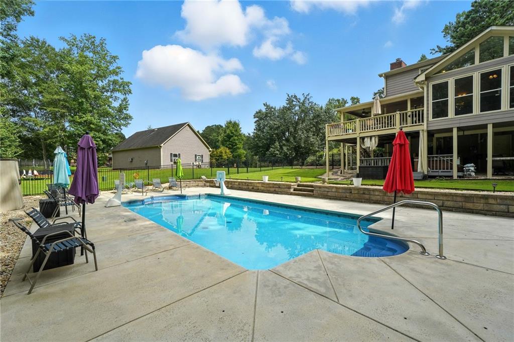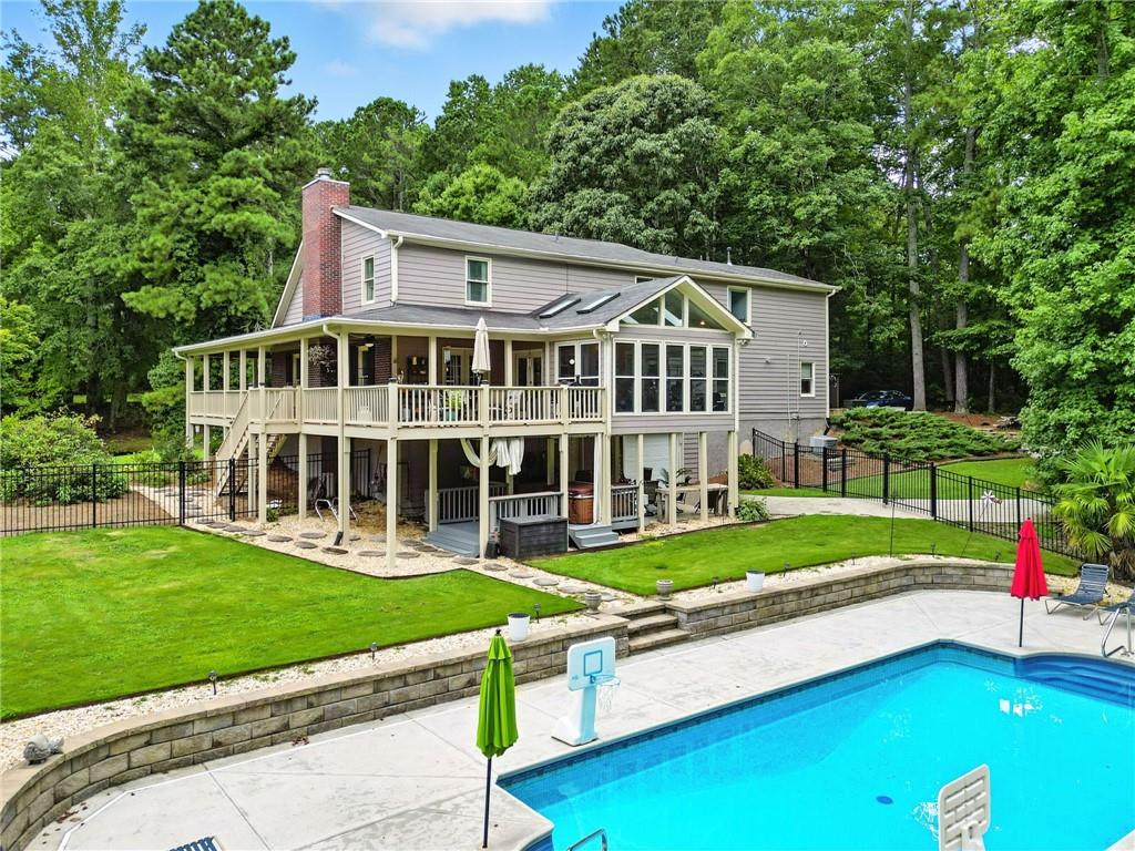 Tucked away on approximately 3.6 private acres this property offers the perfect blend of Southern charm, and outdoor living. This stately home features 4 bedrooms, 3.5 baths, 2 story foyer, partial finished basement, and in ground pool. A classic wrap-around porch welcomes you, offering serene private pond views and a private dock—ideal for morning coffee or evening sunsets. Inside, the kitchen has granite countertops and wood cabinets with a cozy breakfast area flows seamlessly into the inviting family room, complemented by a sunroom and large decks for year-round enjoyment. The spacious master suite includes a sitting room and a beautifully updated shower, while additional bedrooms provide plenty of room for family or guests. Outdoor enthusiasts will appreciate the two separate garages, outbuildings, and abundant storage—perfect for boats, ATVs, or hobby space. With wooded surroundings, a fire pit area, and peaceful water views, you’ll feel worlds away from the bustle, yet remain close to shopping, dining, and schools. This property is a rare find for those seeking comfort, privacy, and a true connection to the outdoors. This property includes two lots with two property ID numbers. Pictures will include some virtual furniture in rooms.