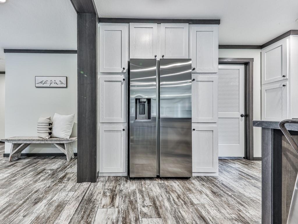 - KitchenCabinets White, Laminate Counters, Kitchen Island, Pantry, View to Family Room