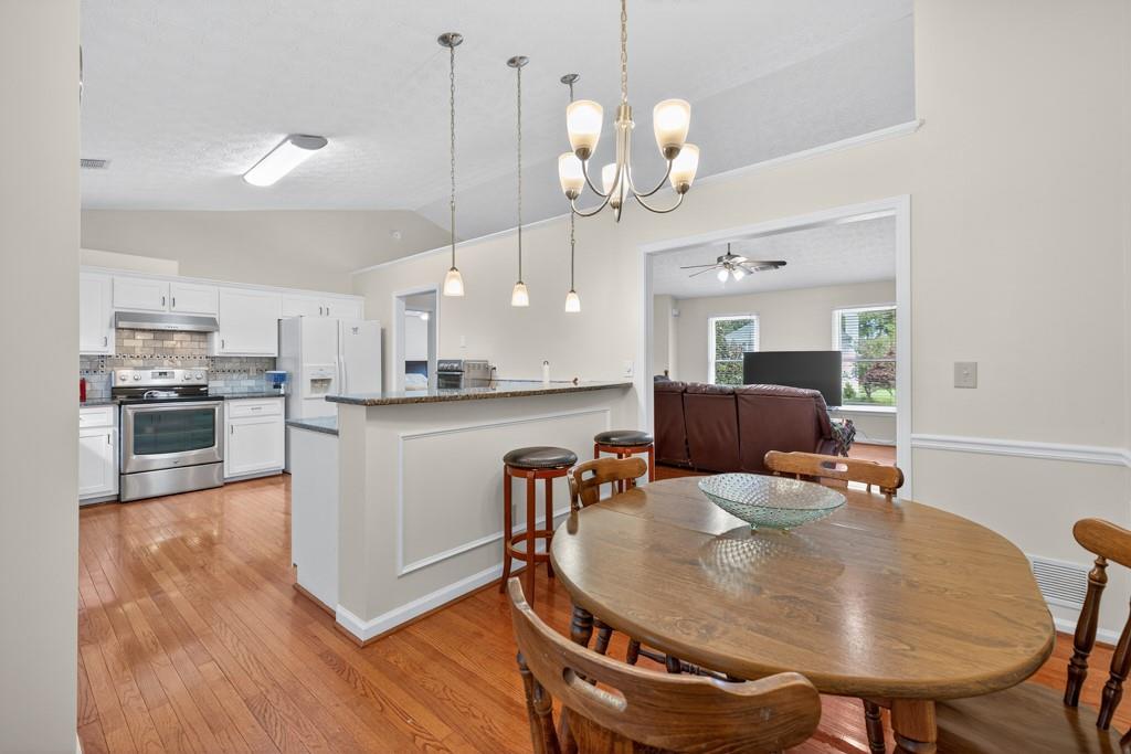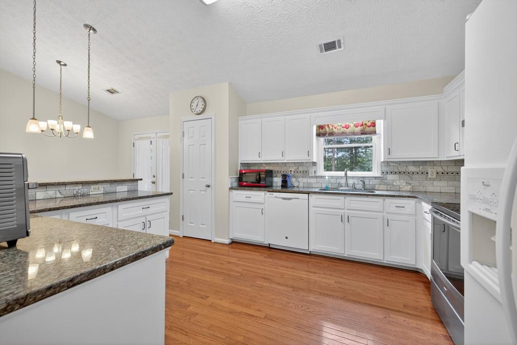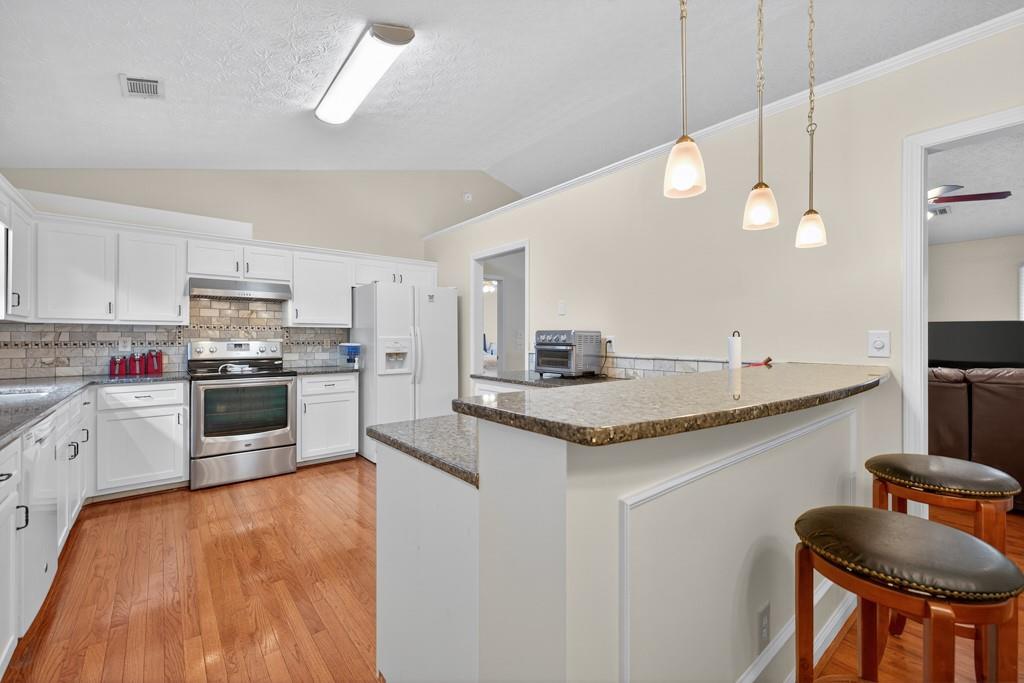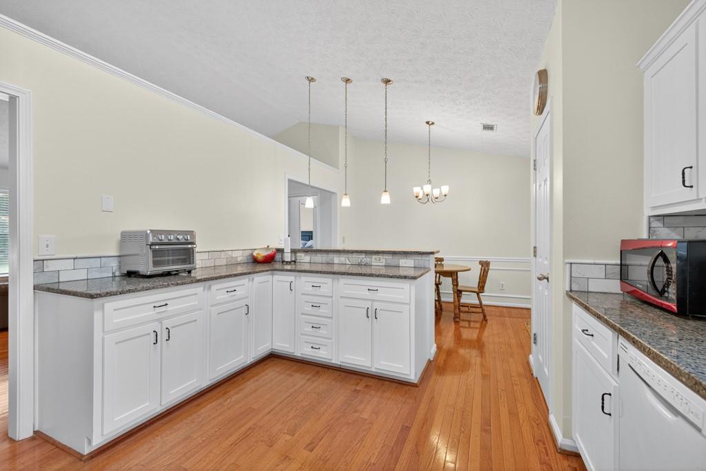 - KitchenBreakfast Bar, Cabinets White, Eat-in Kitchen, Pantry, Stone Counters, View to Family Room