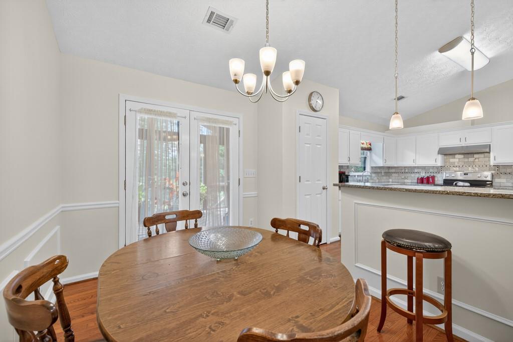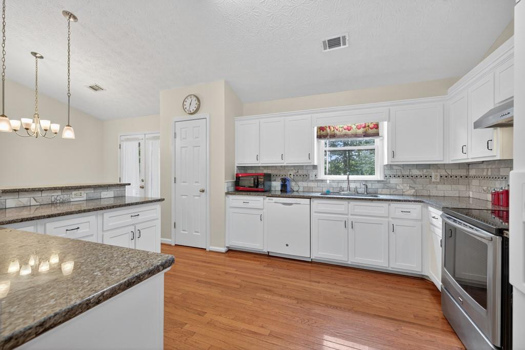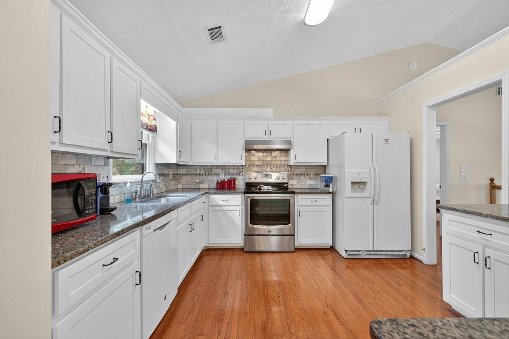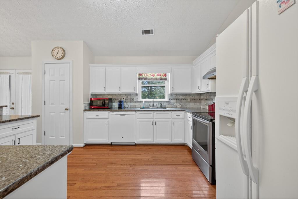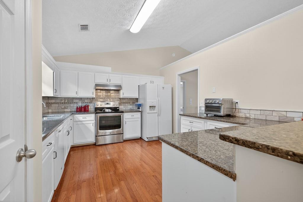 - KitchenBreakfast Bar, Cabinets White, Eat-in Kitchen, Pantry, Stone Counters, View to Family Room