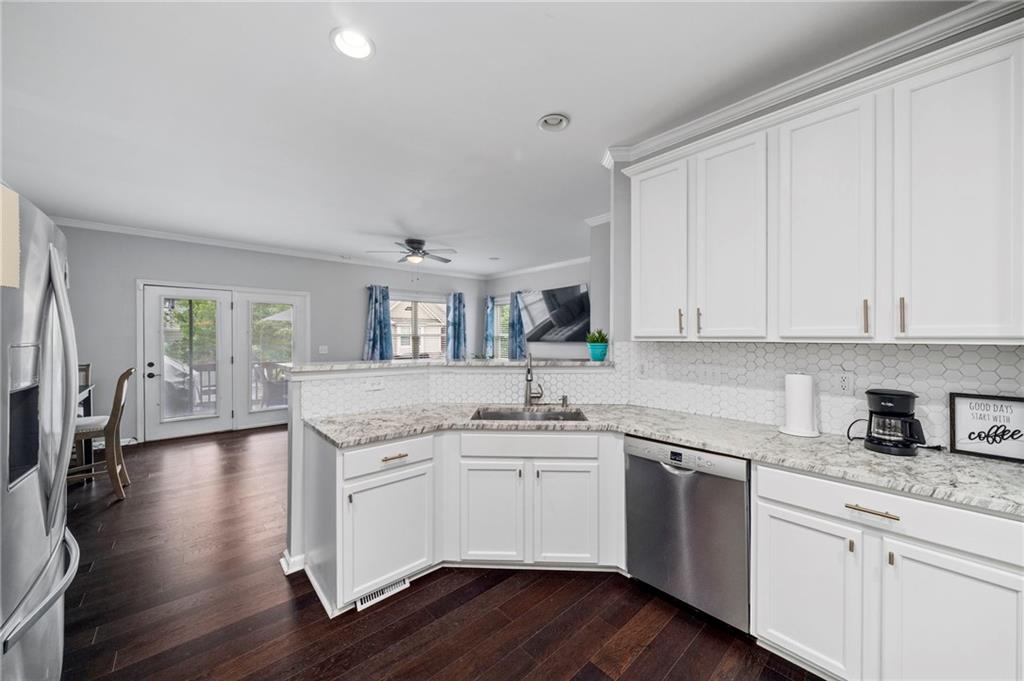 - KitchenBreakfast Bar, Breakfast Room, Cabinets White, Pantry Walk-In, Stone Counters, View to Family Room