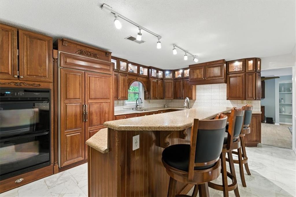 - KitchenBreakfast Bar, Cabinets Stain, Kitchen Island, Stone Counters, View to Family Room