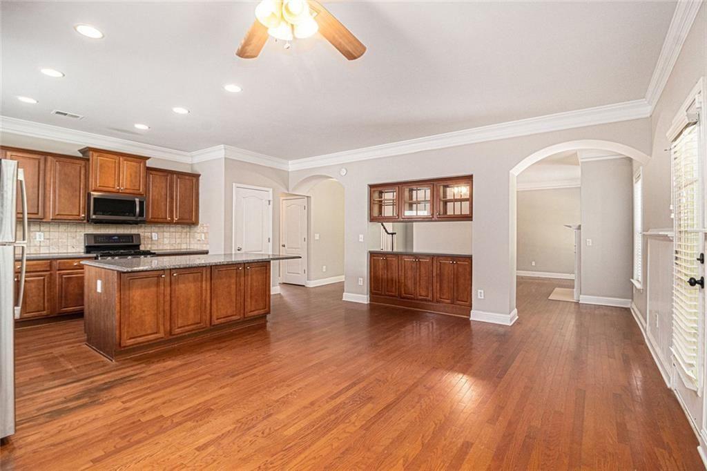 - KitchenCabinets Stain, Breakfast Bar, Kitchen Island, Solid Surface Counters, View to Family Room, Pantry Walk-In