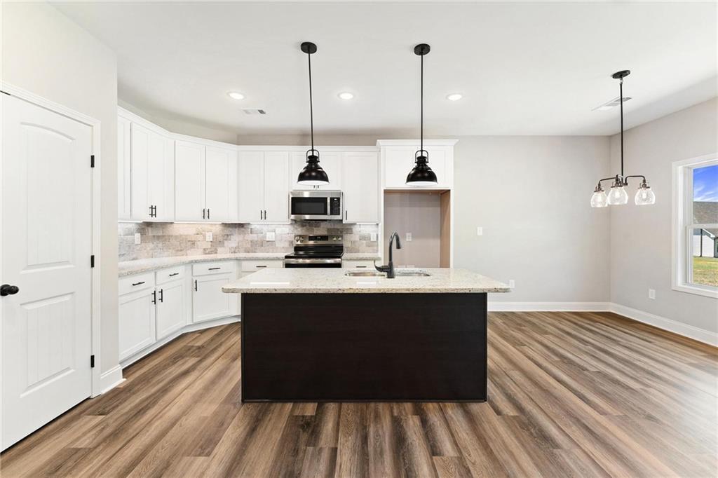 - KitchenCabinets White, Kitchen Island, Pantry, Stone Counters, View to Family Room