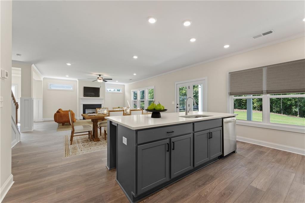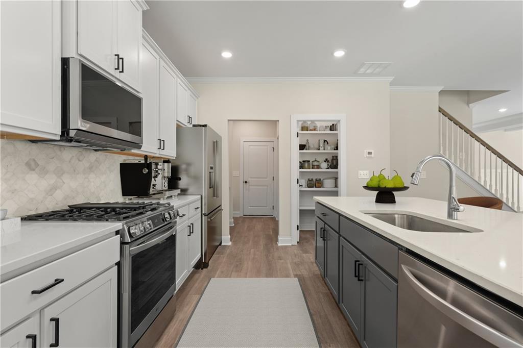 - KitchenCabinets White, Eat-in Kitchen, Kitchen Island, Pantry Walk-In, Solid Surface Counters, View to Family Room