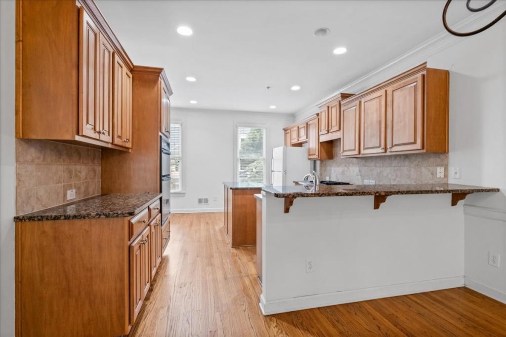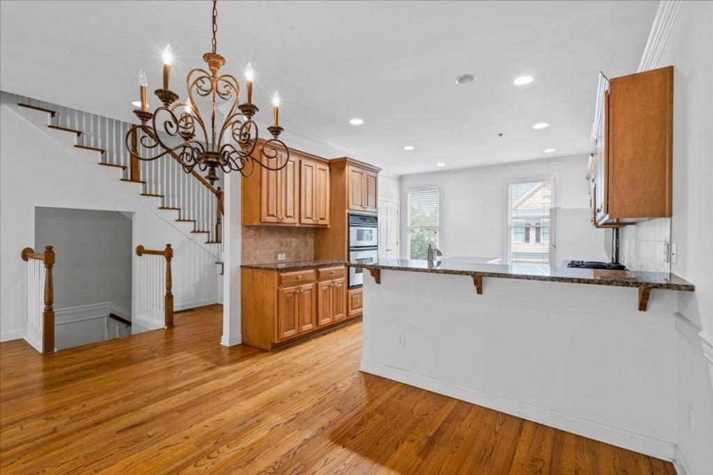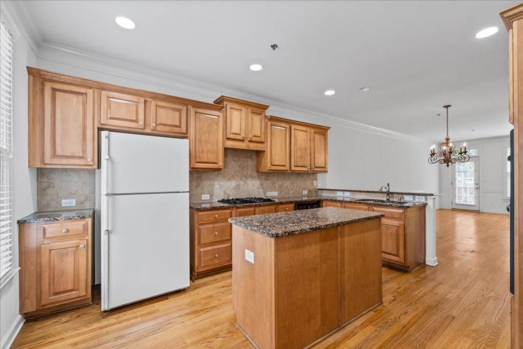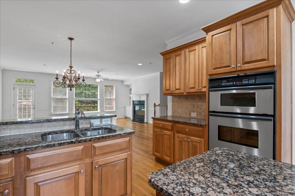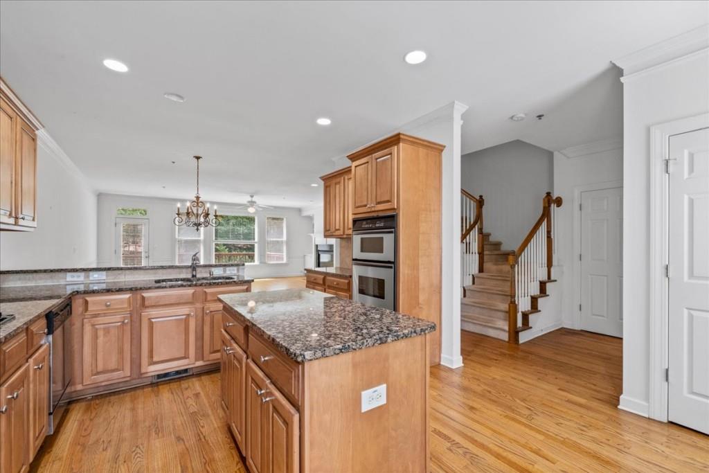 - KitchenCabinets Stain, Kitchen Island, Pantry, Stone Counters, View to Family Room