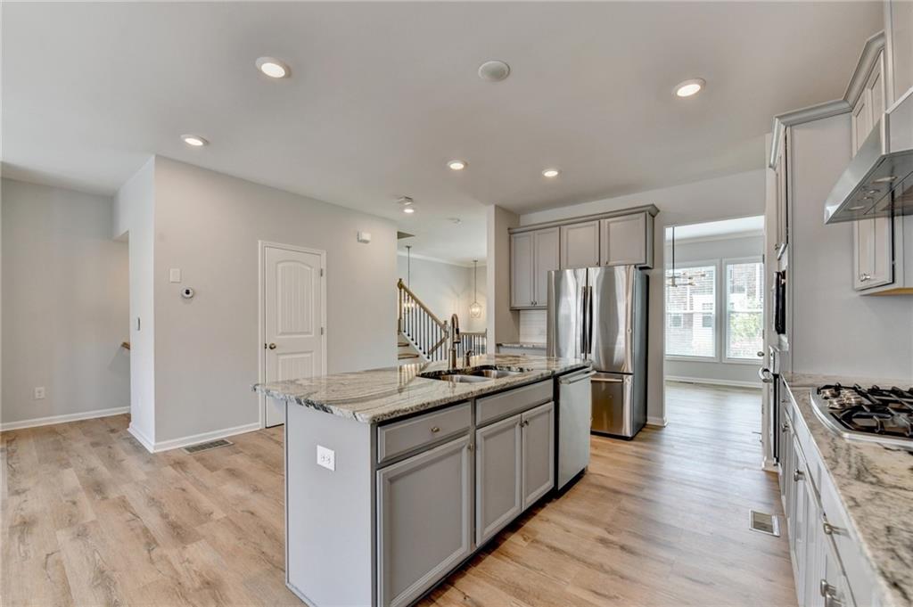 - KitchenCabinets White, Eat-in Kitchen, Kitchen Island, Pantry, Stone Counters, View to Family Room