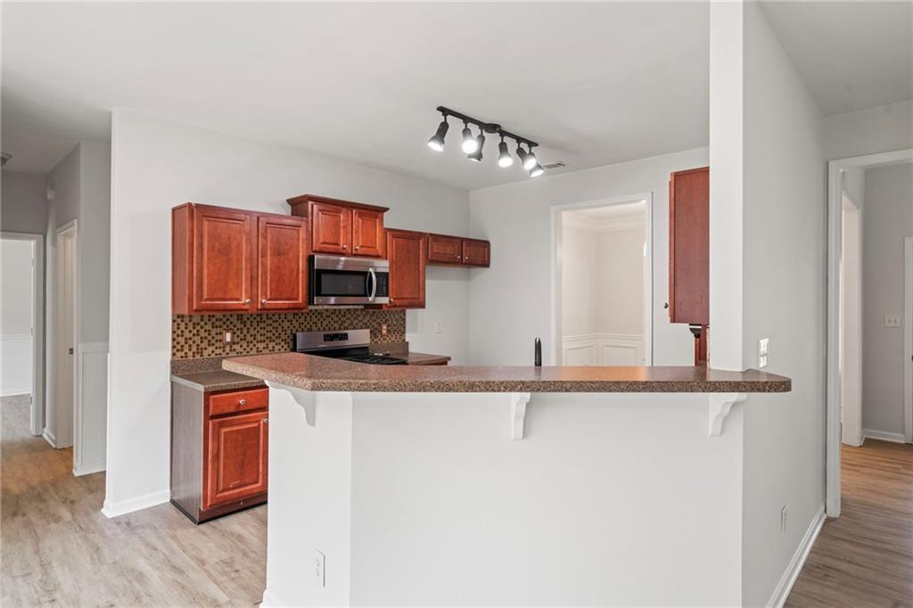 - KitchenBreakfast Bar, Breakfast Room, Cabinets Stain, Laminate Counters, Pantry, View to Family Room