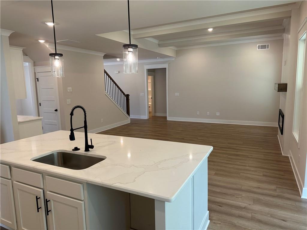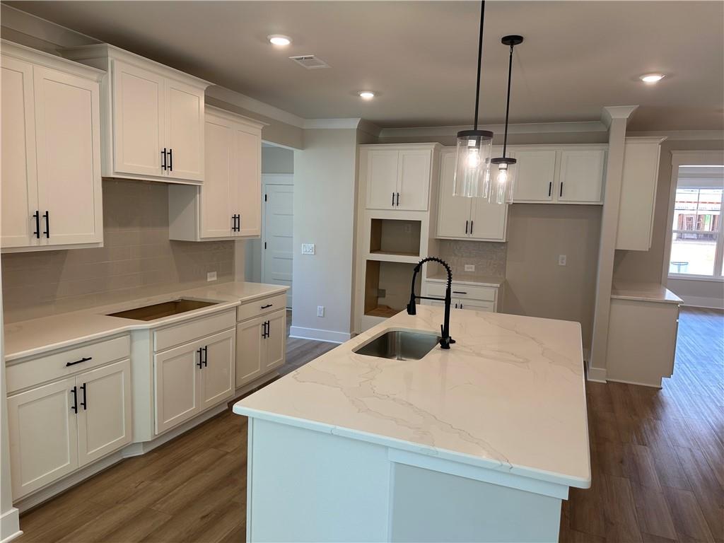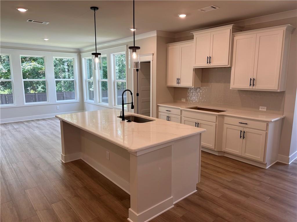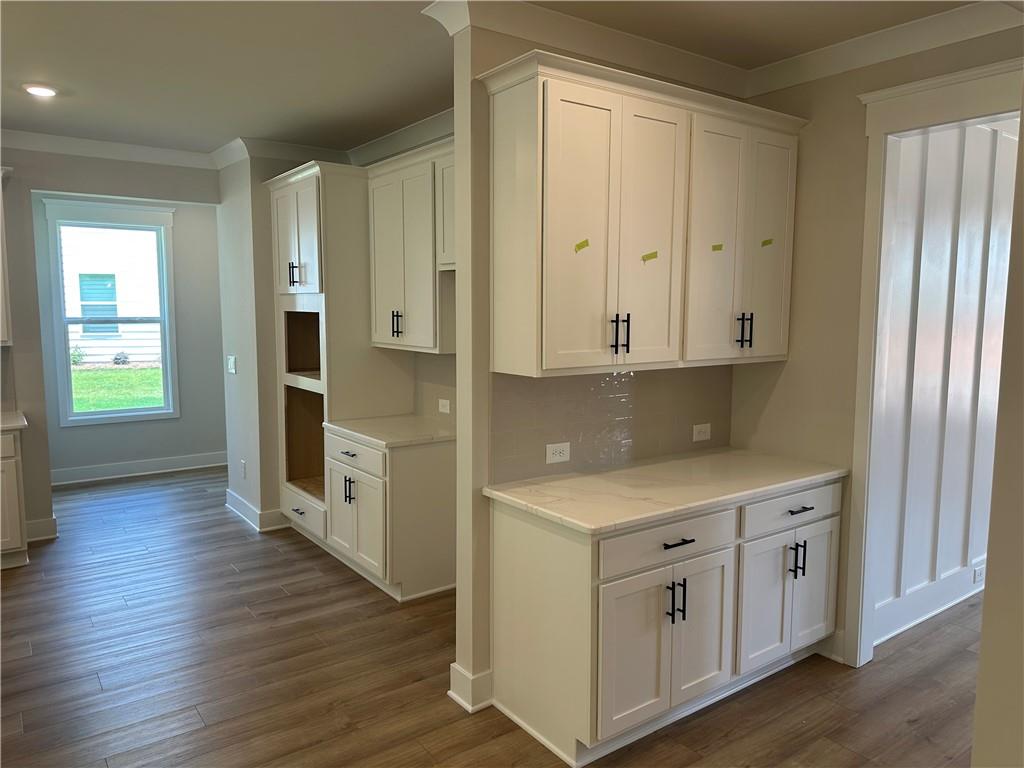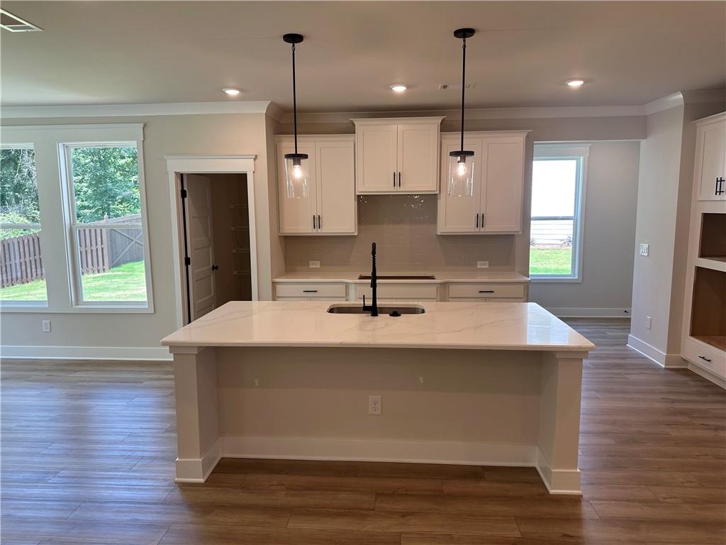 - KitchenCabinets White, Kitchen Island, Pantry Walk-In, Solid Surface Counters, View to Family Room