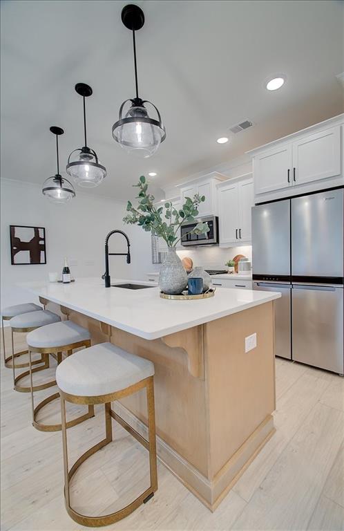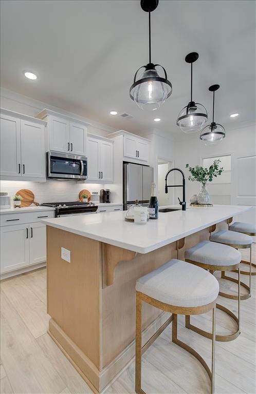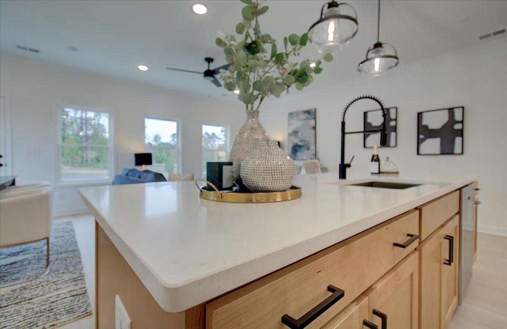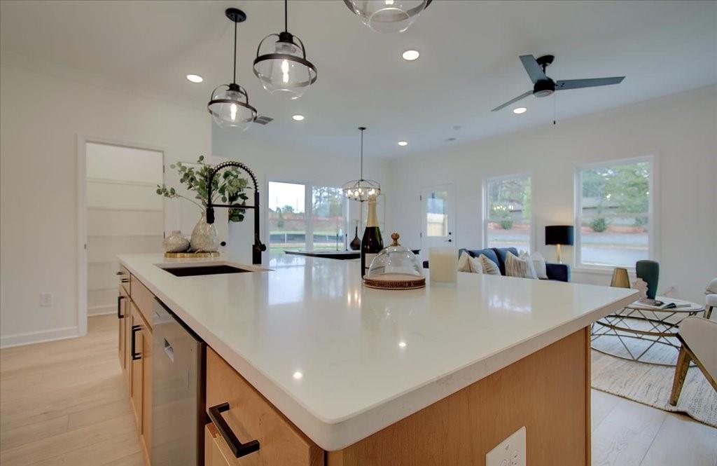 - KitchenBreakfast Bar, Cabinets White, Kitchen Island, Pantry Walk-In, Solid Surface Counters, View to Family Room