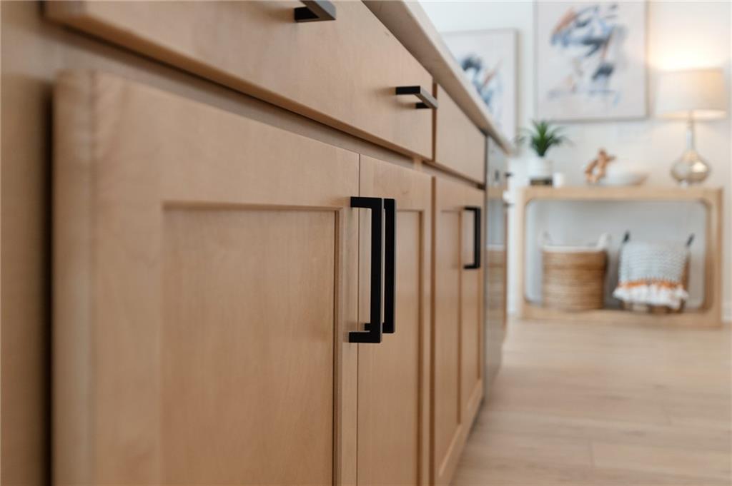 - KitchenBreakfast Bar, Cabinets White, Kitchen Island, Pantry Walk-In, Solid Surface Counters, View to Family Room
