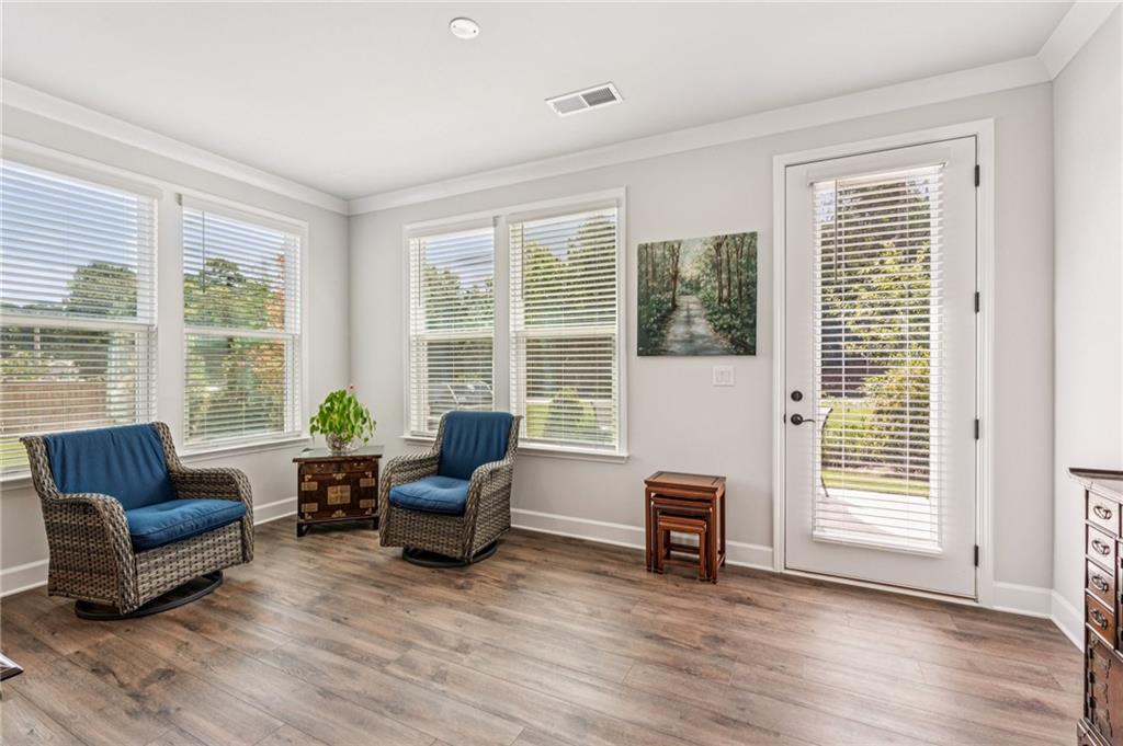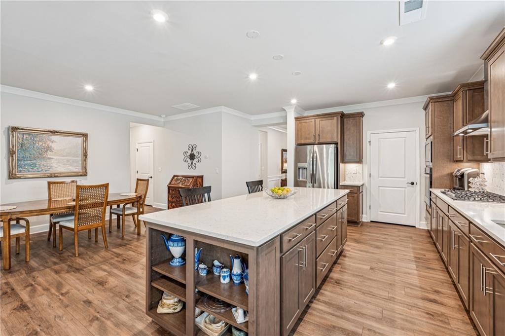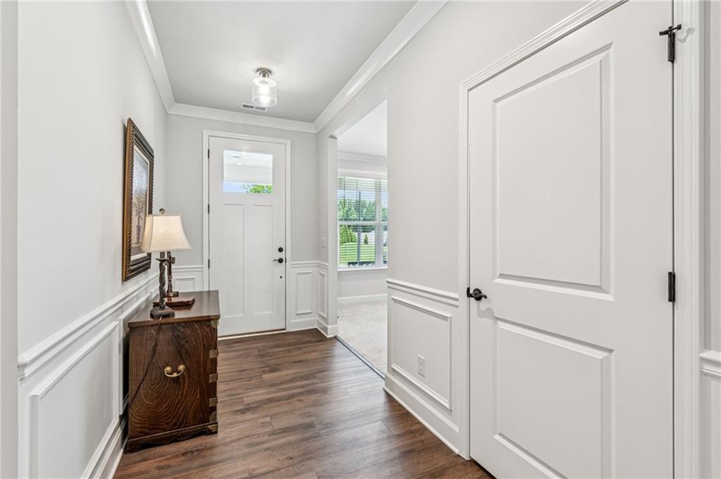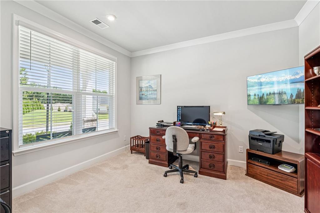 Ready to downsize? This like-new ranch in Buford offers one-level living in a location that can’t be beat—just a short walk to Lake Lanier parks and walking trails, 10 minutes to downtown Buford and Sugar Hill, and 15 minutes to Suwanee or Cumming. Close to all the shopping and dining you could want at the Cumming Marketplace, yet tucked away in a peaceful, country-like setting. Pulte’s popular mainstay floorplan features an open layout with kitchen, dining, and living spaces together, plus a front office overlooking the street. The patio and walkout backyard provide space for grilling or gardening. Inside, updates include crown molding, an oversized quartz island, neutral flooring, 5" baseboards, soft-close drawers, walk-in pantry, and a contemporary hooded vent over the cooktop. The spacious primary suite is a true retreat, featuring a large walk-in closet and a luxurious bathroom with an oversized frameless glass shower enclosure and custom tile. Bright and move-in ready, this home is part of Lakecrest, a 55+ community that include landscaping—perfect for those who want low-maintenance living without paying for extra amenities they won’t use.