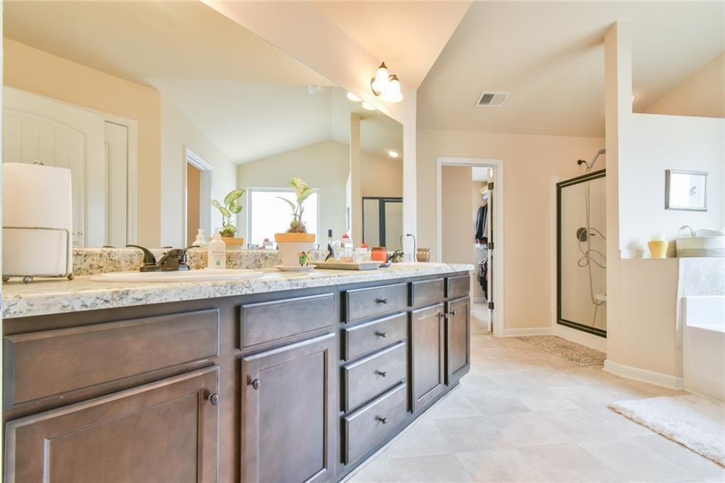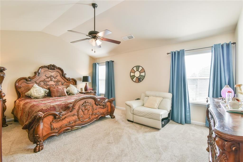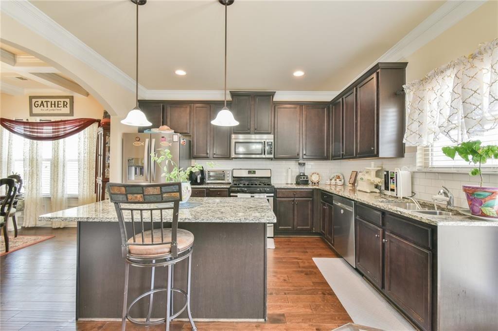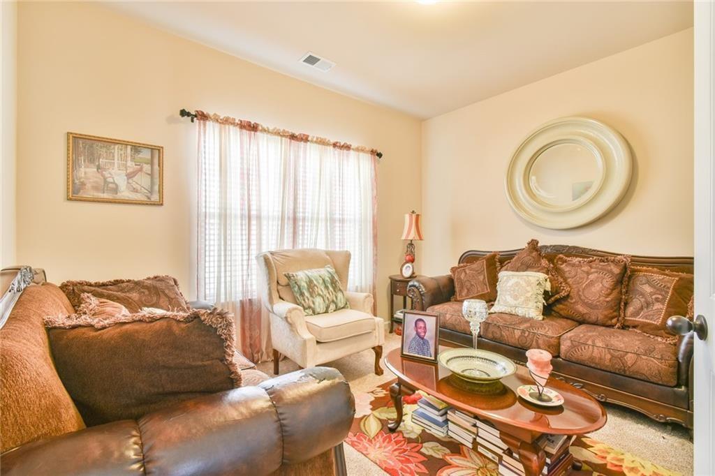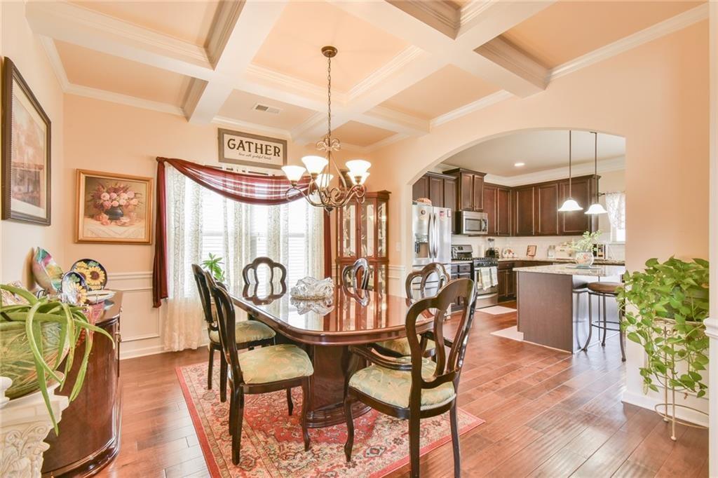 Upon entering this Magnificent 5-bedroom, 3-full bath home, you are greeted by the 2-story foyer, coffered ceilings in the dining room, a formal sitting room, and stunning plank hardwood flooring throughout the main floor. The kitchen boasts a beautiful island, granite countertops, plenty of cabinet space, and features stainless steel appliances. The open view from the Great Room to the Kitchen shows the elegance of the cabinetry and kitchen island where gourmet meals will be prepared. The open concept layout seamlessly connects the kitchen to the dining area, offering a perfect space for entertaining while overlooking the family room with a fireplace. Additionally, the main floor includes a guest bedroom with a full bathroom. The Master Bedroom has vaulted ceilings and is very spacious. The Master Bathroom has a double vanity, soaking tub, separate shower, and an amazing walk-in closet. The second level has 3 additional bedrooms with high vaulted ceilings and a laundry room. A spacious covered patio perfect for lounging or entertaining completes this home. Community is minutes away from Tribble Mill Park, Harbins Park, Ozora Lake, and Summit Chase Country Club. Don't miss out on making this your next humble abode. Come by and check it out, you won't be disappointed