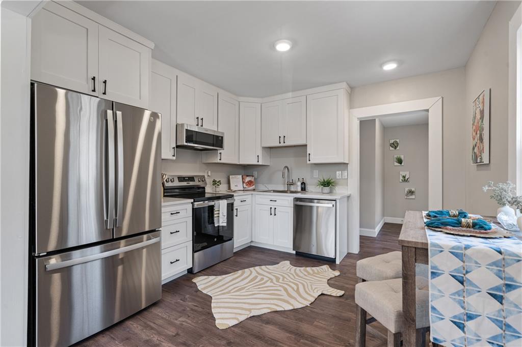 - KitchenCabinets White, Eat-in Kitchen, Stone Counters, View to Family Room