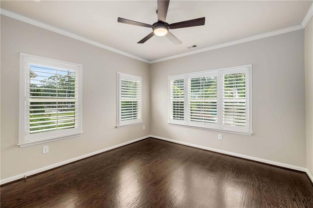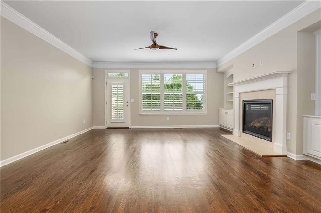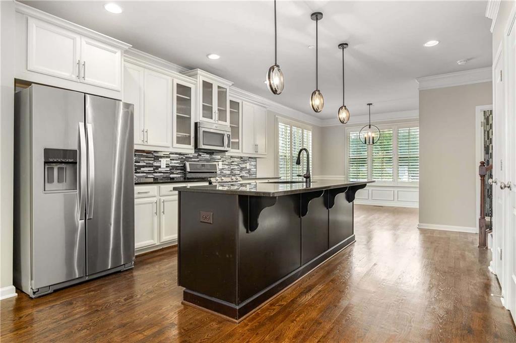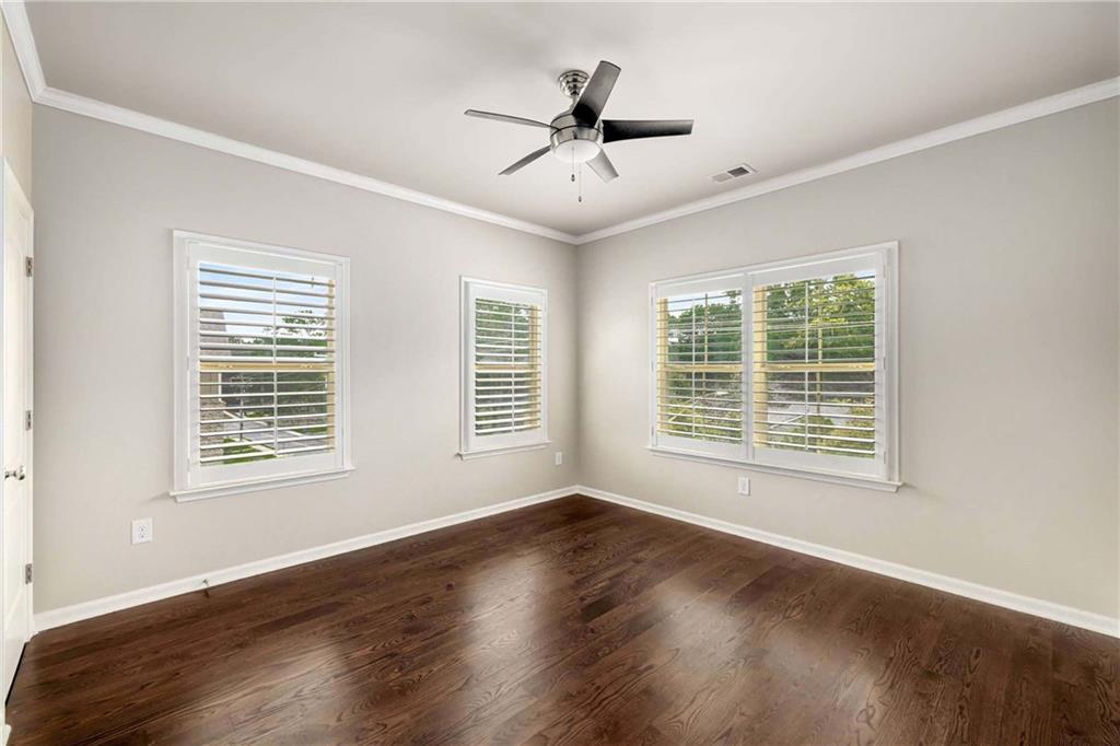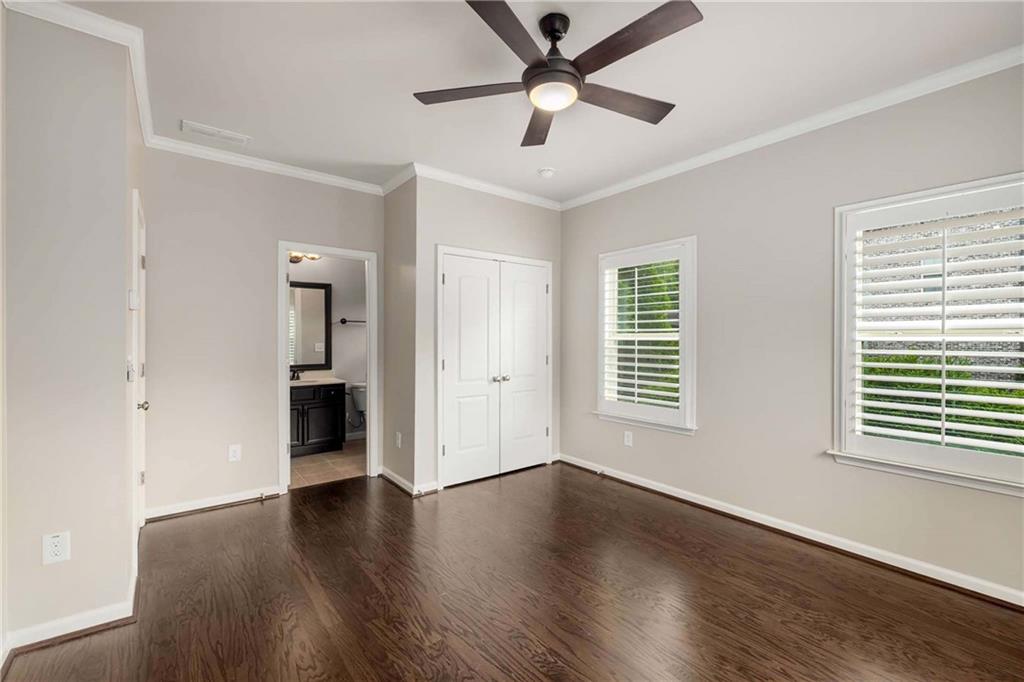 Prime Location, Luxury Finishes, and an Exceptional Floor Plan! Welcome to this stunning three-level end-unit townhouse located in the heart of Smyrna! Perfectly combining luxury, comfort, and convenience, this move-in-ready home is just steps from Downtown Smyrna, with easy access to I-75 and I-285. Featuring extensive upgrades and executive-style details, this home shines with fresh paint, gleaming hardwood floors, plantation shutters throughout, and custom closets in the Owner's Suite. An open-concept main level offers ideal space for entertaining, with a chef's kitchen featuring glass cabinet accents and a large breakfast bar, flowing into a cozy family room with a gas fireplace flanked by built-ins. Step out onto your private wood deck for a breath of fresh air or evening gatherings. The spacious Owner's Suite boasts a coffered ceiling, luxurious oversized shower with a built-in bench, and refined finishes throughout. Each secondary bedroom includes a private ensuite, and a stylish half bath is conveniently located on the main level. Additional highlights include enhanced security features, beautiful custom window treatments, and sidewalk access to Smyrna Village shops, dining, and the Farmer's Market. Plus, you're just 2.5 miles from The Battery and Truist Park! Please note some of the listing pictures have been virtually staged.