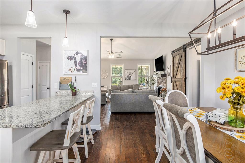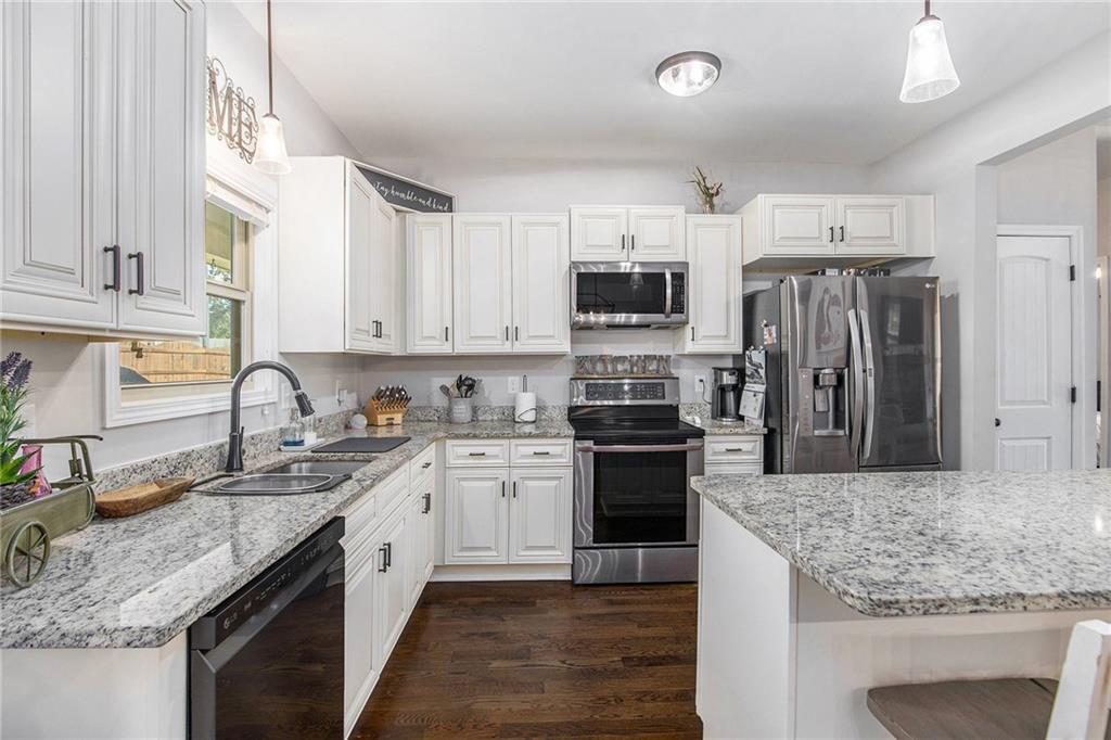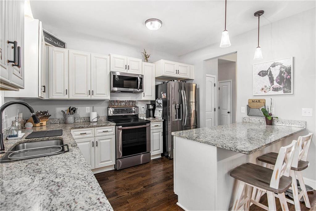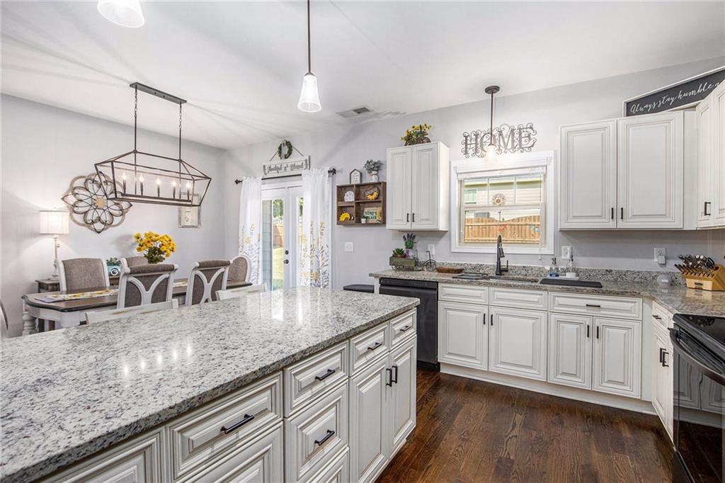 - KitchenBreakfast Bar, Cabinets White, Country Kitchen, Eat-in Kitchen, Pantry, Stone Counters, View to Family Room